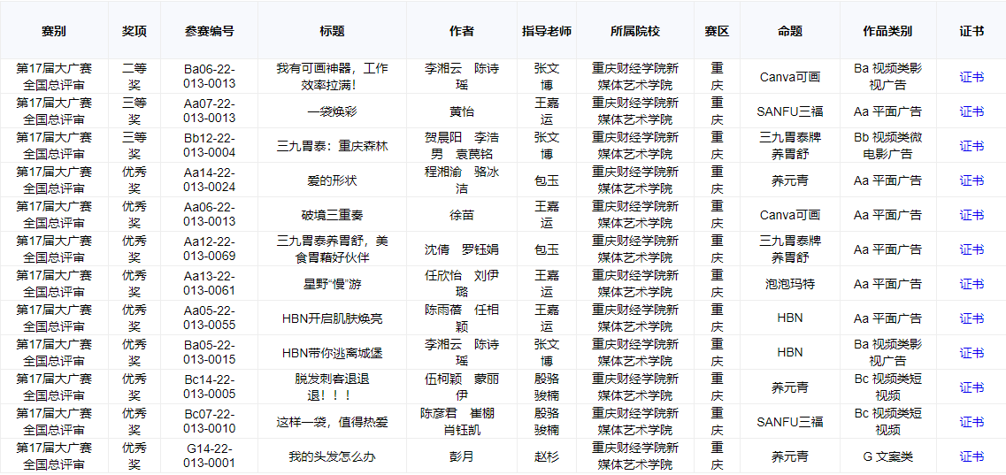9月6日,第十七届全国大学生广告艺术设计大赛(简称“大广赛”)获奖名单揭晓,重庆财经学院新媒体艺术学院学子斩获国奖12项,省级奖183项。