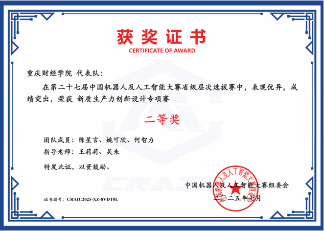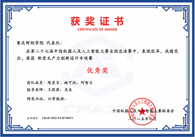 近日,第二十七届中国机器人及人工智能大赛新质生产力创新设计专项赛获奖名单正式揭晓,重庆财经学院软件学院学子表现优异,荣获国家级奖项1项、省级奖项2项。