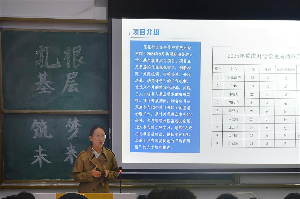 宣讲会伊始,王老师以2025届基层实践项目成果为案例切入点,随后从岗前集中培训、岗后实践锻炼两个维度系统介绍实习项目的整体架构,为学生绘制了从"赛道选择-能力准备-岗位适配"的全周期参与指南。