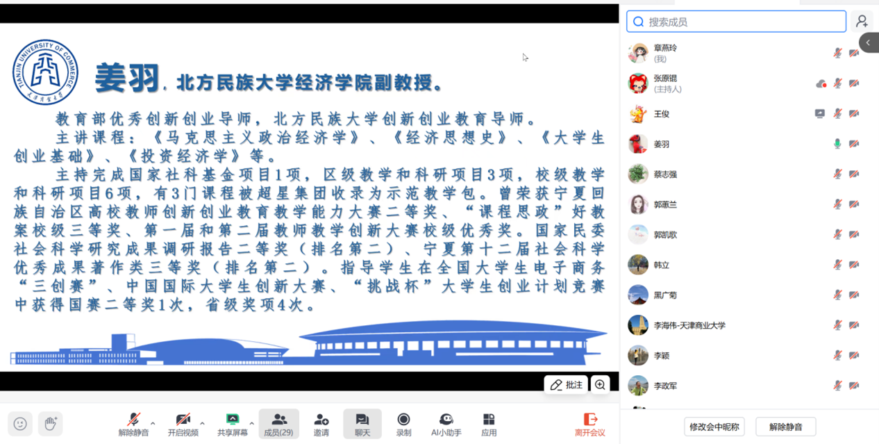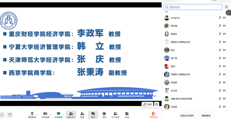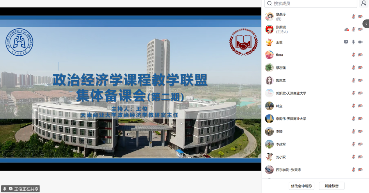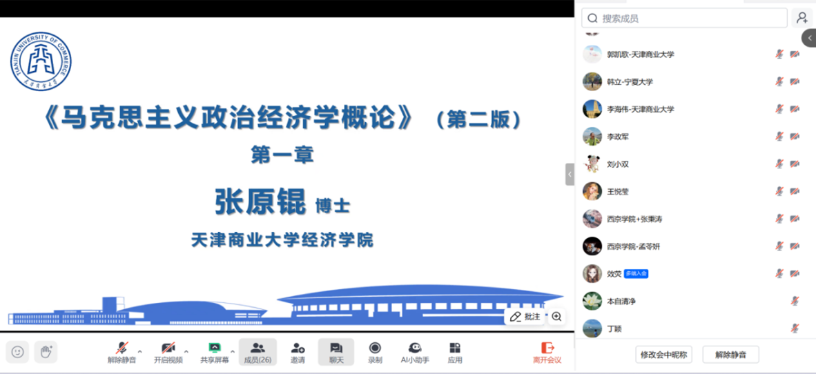 10月25日下午2点至4点,我校市级经济学课程群虚拟教研室联合发起的全国政治经济学集体备课会,通过腾讯会议(会议号:216112591)在线开展第二次集体备课会。参加这次备课会的高校有重庆财经学院、宁夏大学、天津商业大学、天津财经大学、天津师范大学、北方民族大学、西华大学、兰州财经大学、西京学院等九所高校30位政治经济学任课教师,围绕马工程《马克思主义政治经济学概论》第一章“商品”展开。此次备课会由天津商业大学政治经济学教研室组织,教研室主任王俊副教授主持。