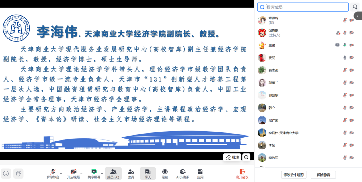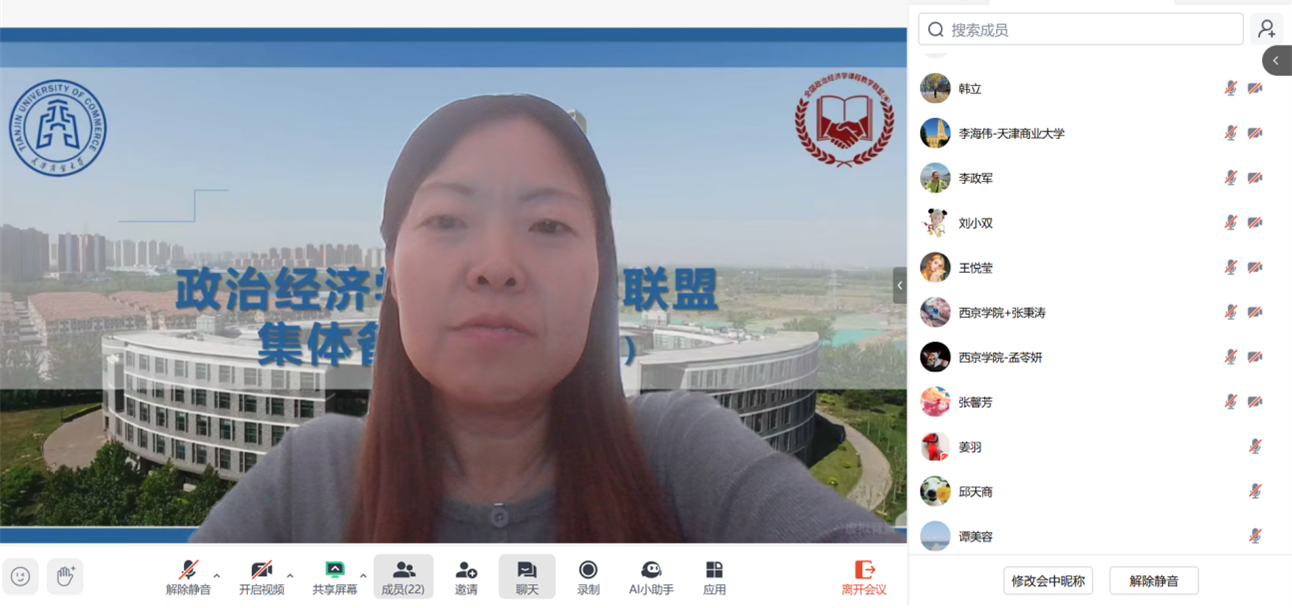会议伊始,天津商业大学经济学院经济系教师党支部书记、系主任李颖副教授发言致辞。她首先对我校市级经济学课程群虚拟教研室负责人李政军教授在组织全国政治经济学集体备课联盟中付出的努力表达了诚挚的感谢。接着,李书记介绍了天津商业大学政治经济学课程的建设情况,着重强调集体备课以及AI教学应用的重要性。她指出,政治经济学课程在经济学教育体系中占据着基础性的关键地位,是培养学生经济学思维和素养的基石。此次借助联盟平台开展集体备课,正是期望各高校能够共享教学经验,携手提升教学质量,让联盟成为推动课程建设的加油站,助力教师成长的孵化器。