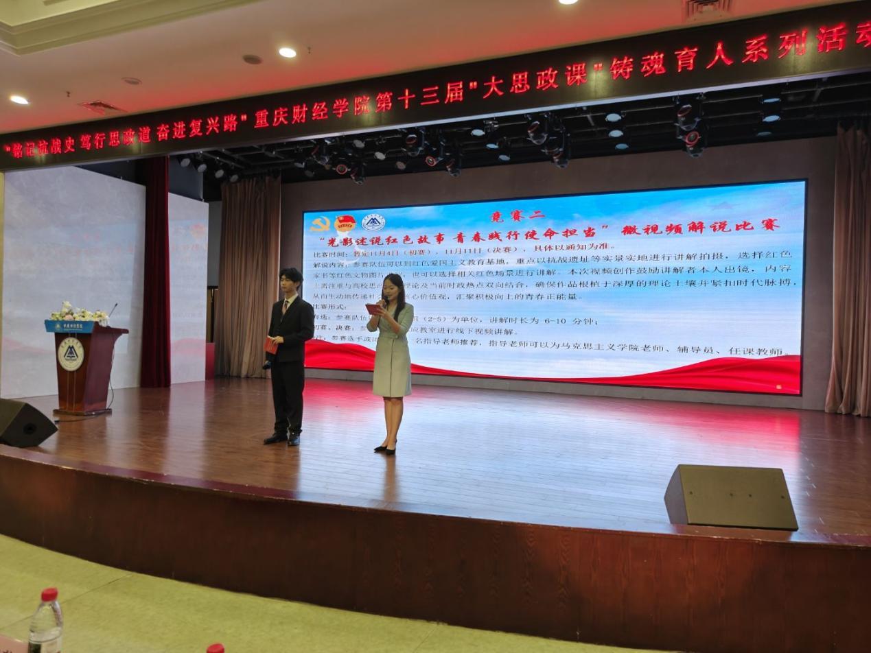为将抗战历史教育与思政育人深度融合,引导师生从红色历史中汲取力量,进一步凝聚强国建设、民族复兴青春动能,10月29日中午,由重庆财经学院马克思主义学院、重庆财经学院党委宣传部、共青团重庆财经学院委员会、重庆市巴南区教师进修学院、重庆财经学院公共管理学院、重庆财经学院新媒体艺术学院主办,公共管理学院团总支、学生会,新媒体艺术学院团总支、学生会承办的第十三届“大思政课”铸魂育人活动,在学术报告厅正式启动。
