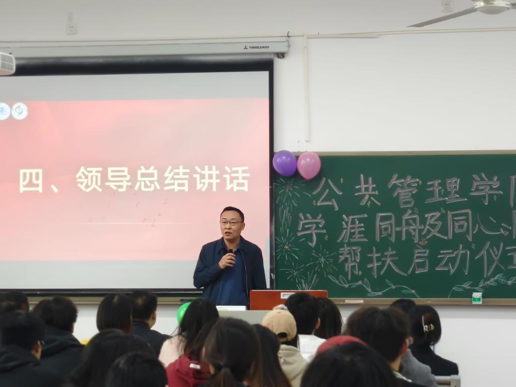 为深入推进学风建设,充分发挥学生组织与骨干的引领作用,2025年11月,公共管理学院在教学楼举行第二届学涯同舟及同心同路帮扶活动启动仪式。校党委委员、副校长李春雷亲临启动仪式现场指导,还参与后续校领导午餐会,与师生代表深入交流,为学风建设出谋划策。公共管理学院院长李辉、党总支书记罗婷婷,全体学工队伍教师、学生组织工作人员及学生代表共同参与。