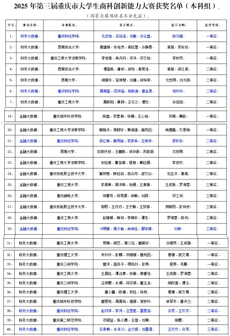 本次大赛本科组聚焦财务大数据、金融大数据、税务大数据三大核心赛项,吸引了全市多所高校的121支优秀团队同台竞技。重庆财经学院学子在各赛项中表现亮眼。其中,由陈元媛老师指导的财务2队(孔欣怡、石裕佳、刘敏、谈云鑫)荣获一等奖,由杨玲玲老师指导的财务1队(聂婉盈、闫诗涵、杨凯迪、唐金源)荣获二等奖,由廖秋宇老师指导的金融1队(梁红梅、谢雨言、李彦林、王琳淋)荣获二等奖,由刘柳老师指导的金融2队(冷明穗、周子榆、肖林钰、鄢宇婷)荣获二等奖,由许爽、王欢欢联合指导的税务2队(赵丹萍、李月、汪昱聪、雷雯洁)荣获二等奖,税务1队(石承柳、涂洋川、全文银、刘星语)荣获三等奖。