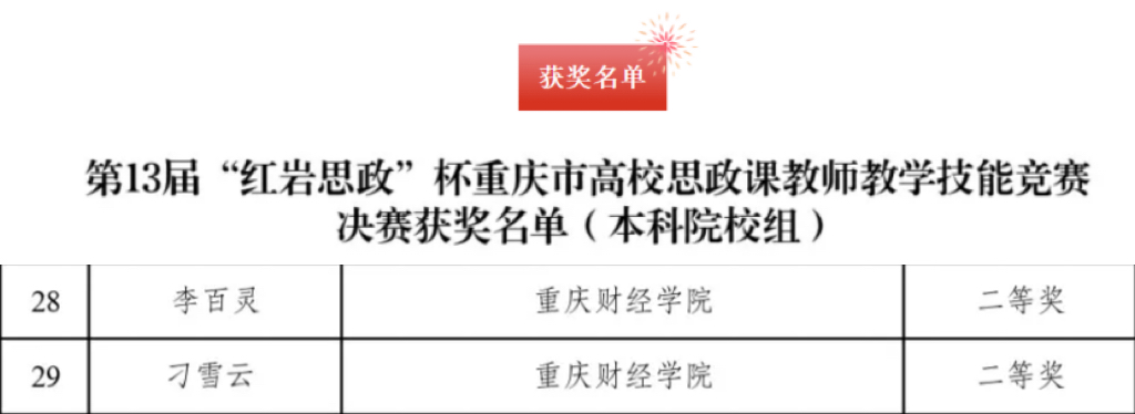 11月20日-21日,第13届“红岩思政”杯重庆市高校思想政治理论课教师教学技能竞赛决赛在西南大学举行。我校马克思主义学院教师李百灵、刁雪云老师历经校级两轮选拔、市级复赛、决赛共四轮比拼,凭借扎实的理论功底、创新的教学设计和生动的课堂呈现,最终在决赛中双双荣获二等奖,为学校赢得荣誉。