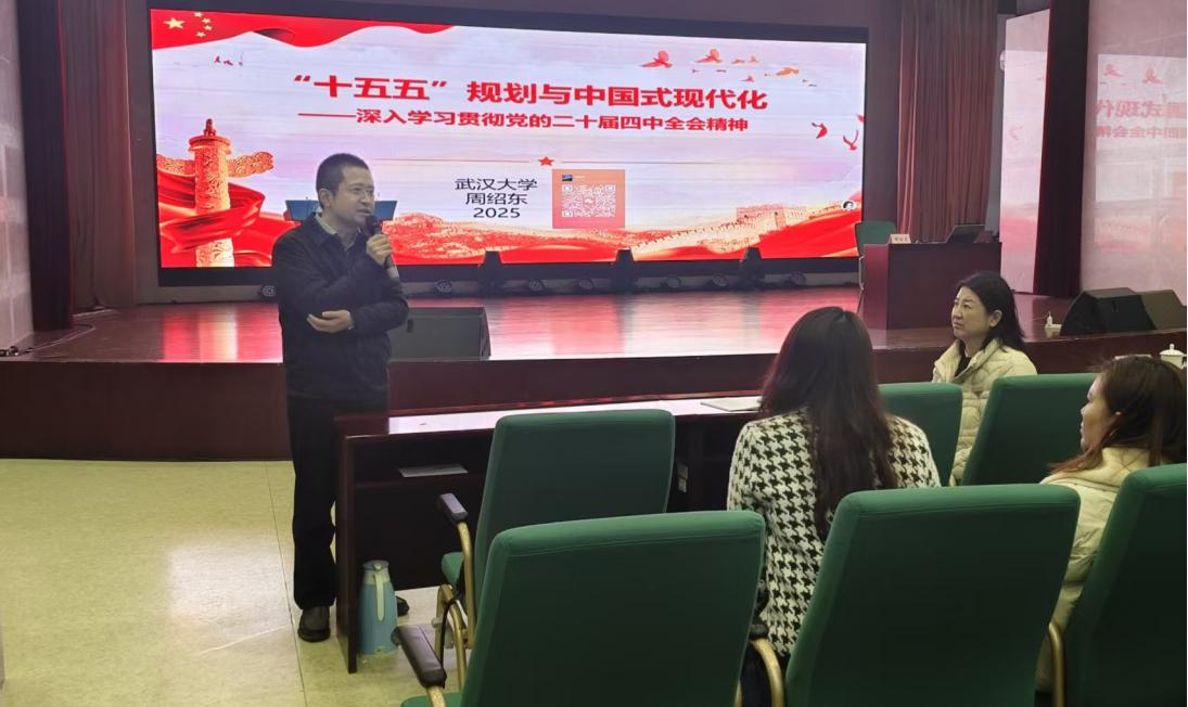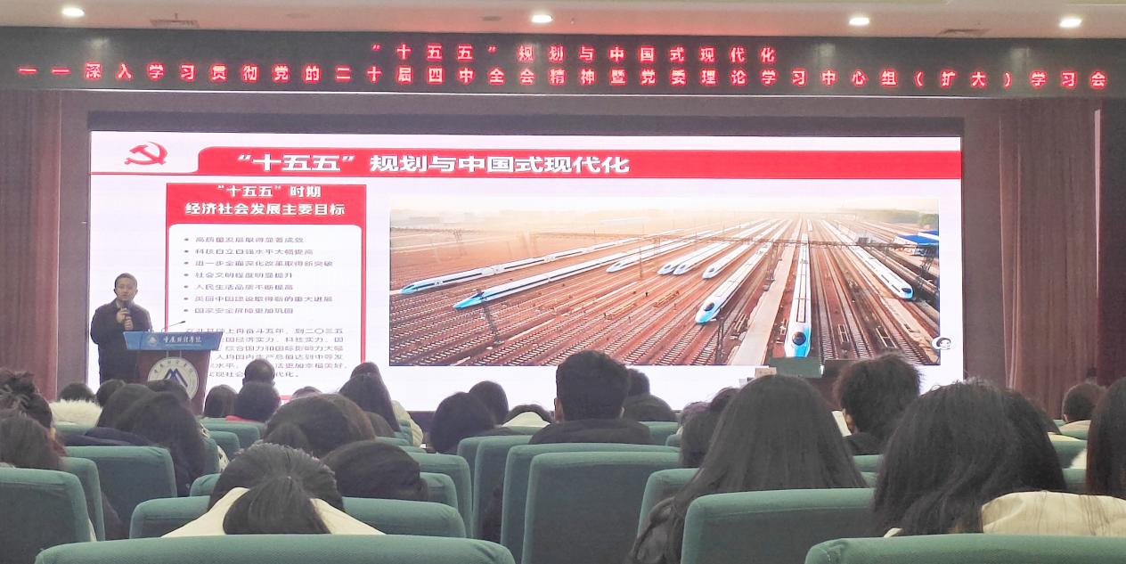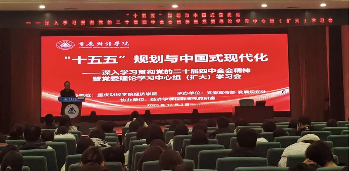 2025年12月2日下午,一场聚焦“‘十五五’规划与中国式现代化”的党委理论学习中心组(扩大)学习会在我校学术报告厅热烈开展。本次学习会特邀学术领域资深专家、武汉大学的周绍东教授,以“‘十五五’规划与中国式现代化”为主题进行分享。学校党委委员、校领导,各二级学院党总支、直属党支部书记,教师、学生党支部书记及师生党员代表参加。