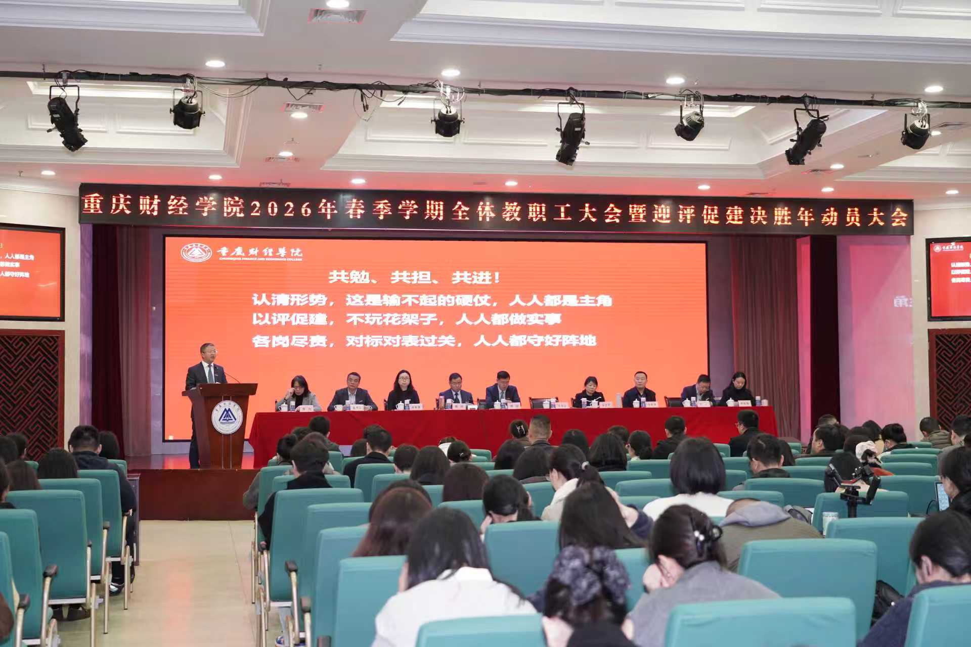 2月27日上午9:00,学校2026年春季学期全体教职工大会暨“迎评促建决胜年”动员部署会在学术报告厅顺利召开。会议深入学习贯彻教育部本科教学工作合格评估最新文件精神,部署迎评任务,凝聚全体重财家人干事创业新合力,共勉共担共进,共生共赢共发展。会议设各二级学院分会场。会议由党委书记张毅主持,校长吴华安、指挥长出席会议并讲话。