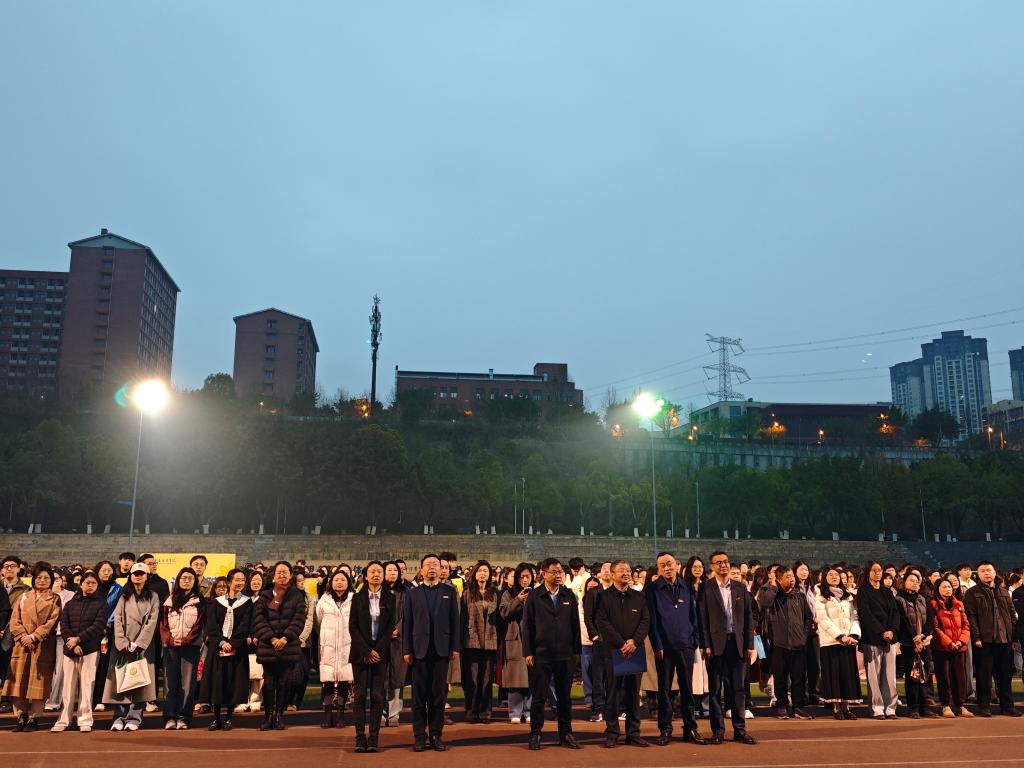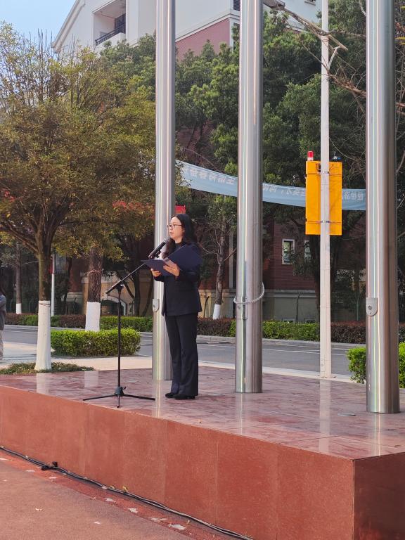 随着雄壮激昂的《义勇军进行曲》,五星红旗冉冉升起,全体师生肃立行注目礼,齐声高唱国歌,表达对祖国的崇高敬意。