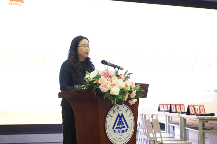 我校党委副书记房朝君出席活动并致辞。她代表承办方重庆财经学院,向全体参赛选手致以热烈祝贺,向莅临指导的重庆市消费者权益保护委员会、巴南区市场监督管理局、区消委会、区人民法院、区公安分局、区金融监管分局、中国人民银行巴南分行、浦发银行等单位的各位领导、嘉宾,以及各兄弟院校、评委老师和全体工作人员表示衷心感谢。