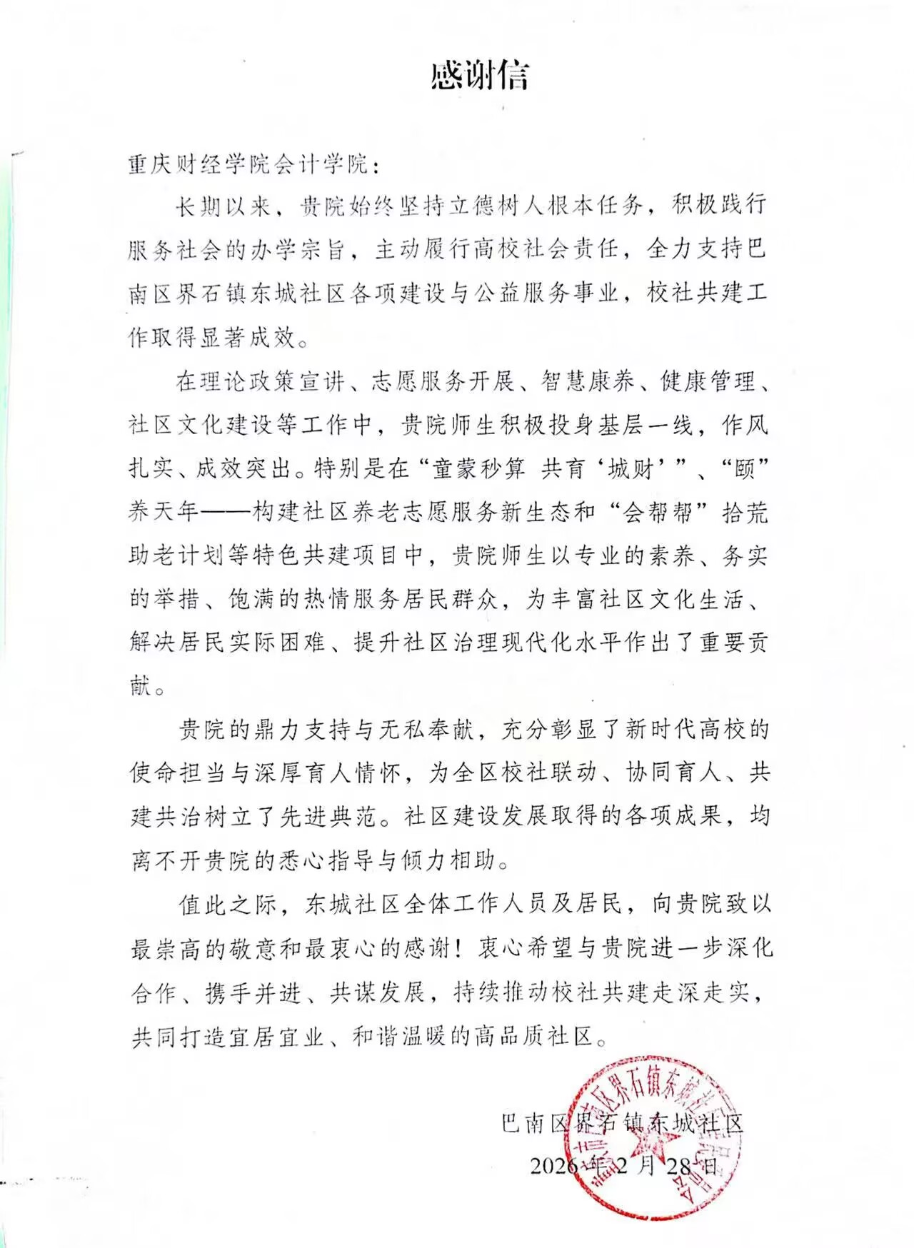 此次致谢,既是东城社区对会计学院前期校地共建工作的高度认可,更是双方深化合作、携手共进的新起点。下一步,会计学院将持续立足专业特色,深化校地协同联动,推动优质教育资源、人才资源下沉基层,在服务社区高质量发展、助力基层治理现代化进程中,主动作为、担当尽责,续写校地共建新篇章。