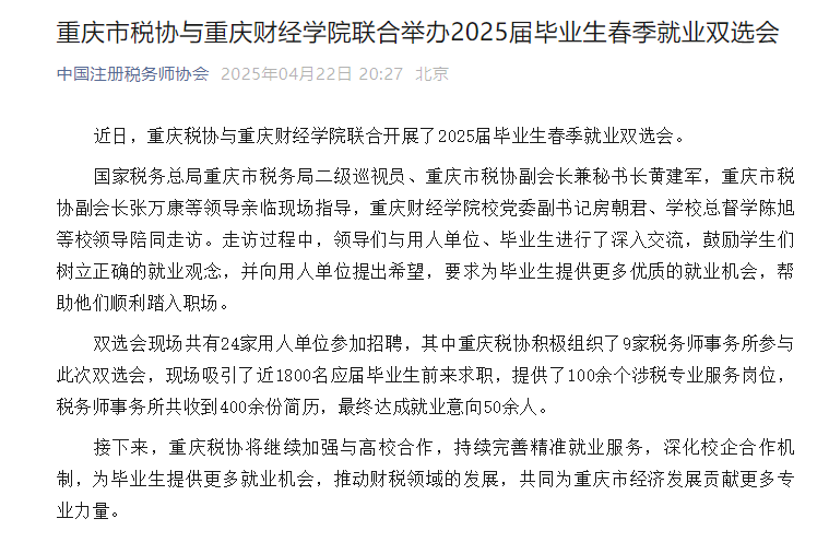 近日,重庆税协与重庆财经学院联合开展了2025届毕业生春季就业双选会。 国家税务总局重庆市税务局二级巡视员、重庆市税协副会长兼秘书长黄建军,重庆市税协副会长张万康等领导亲临现场指导,重庆财经学院校党委副书记房朝君、学校总督学陈旭等校领导陪同走访。走访过程中,领导们与用人单位、毕业生进行了深入交流,鼓励学生们树立正确的就业观念,并向用人单位提出希望,要求为毕业生提供更多优质的就业机会,帮助他们顺利踏入职场。 双选会现场共有24家用人单位参加招聘,其中重庆税协积极组织了9家税务师事务所参与此次双选会,现场吸引了近1800名应届毕业生前来求职,提供了100余个涉税专业服务岗位,税务师事务所共收到400余份简历,最终达成就业意向50余人。 接下来,重庆税协将继续加强与高校合作,持续完善精准就业服务,深化校企合作机制,为毕业生提供更多就业机会,推动财税领域的发展,共同为重庆市经济发展贡献更多专业力量。 媒体链接: https://mp.weixin.qq.com/s?__biz=MzA5NjQ0ODg3NA==&mid=2676820369&idx=2&sn=baa51227ae0b7cedacc2d3070057ec19&chksm=8b12739a6d5dd83d32b5f60c688601982b3b3fcaaff8c32359265a08d9129c5793bc10176071&mpshare=1&scene=23&srcid=0422EtWid3QWix9l0daH7t65&sharer_shareinfo=f23c342d59d5ed289f1c0c25d79a1970&sharer_shareinfo_first=a7c8f892faa1508e10ddbaeb24e892d7#rd