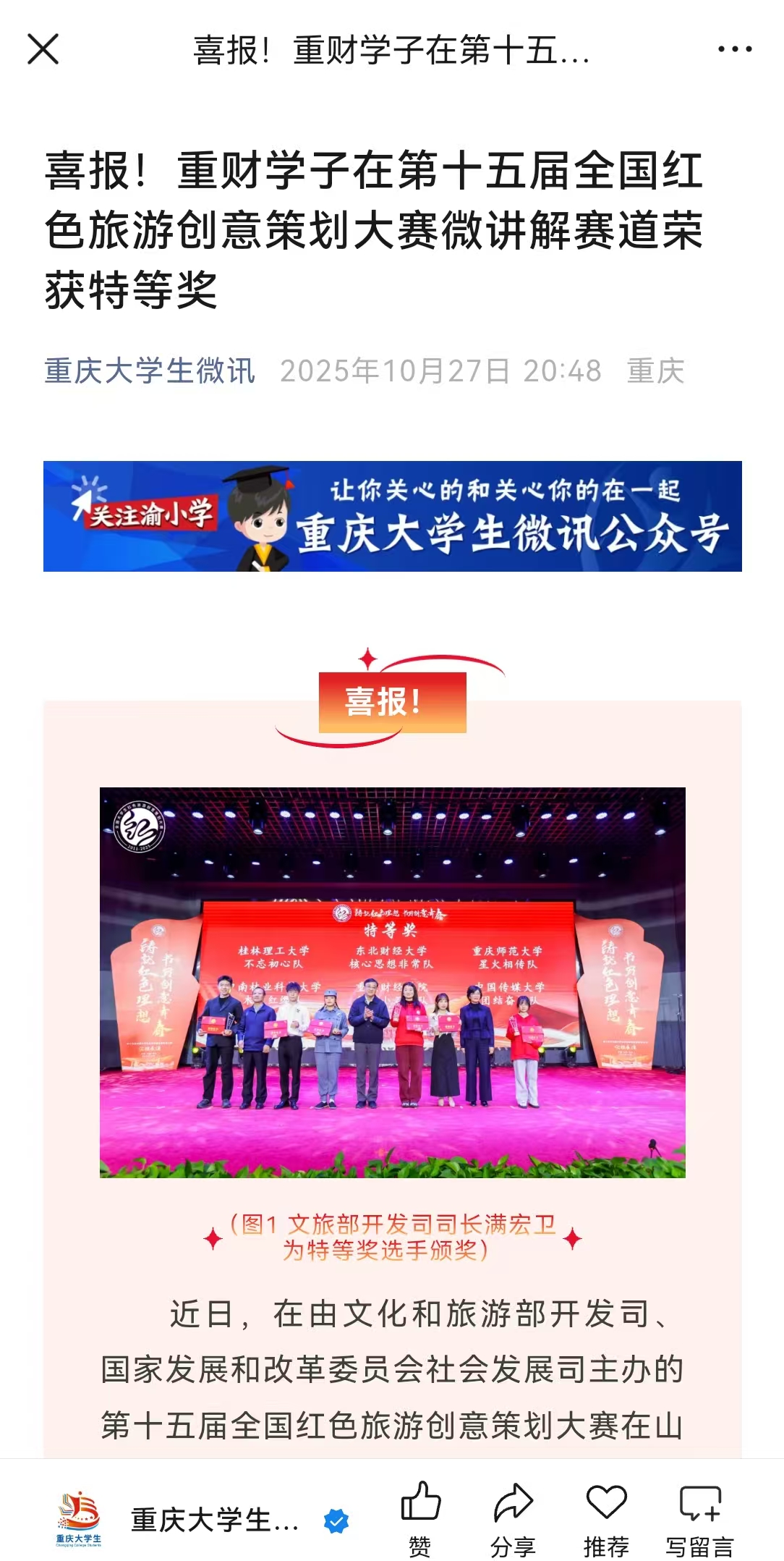 近日,在由文化和旅游部开发司、国家发展和改革委员会社会发展司主办的第十五届全国红色旅游创意策划大赛在山西武乡成功举办。由曹阳、梁金琼、赵玉悦、李叔红组成的重庆财经学院金融学院代表队,在马珂、卿天赐等老师的指导下,以《太行山的回响:马背上的银行》视频作品,在微讲解赛道中,顶住压力,荣获全国特等奖。这是该校首次闯入全国决赛并最终以“黑马”姿态夺得全国第一,充分体现了学校学生在创意策划与现场表达方面的综合素质与实践能力,反映学校坚持“以赛促教、以赛促学”的育人理念。