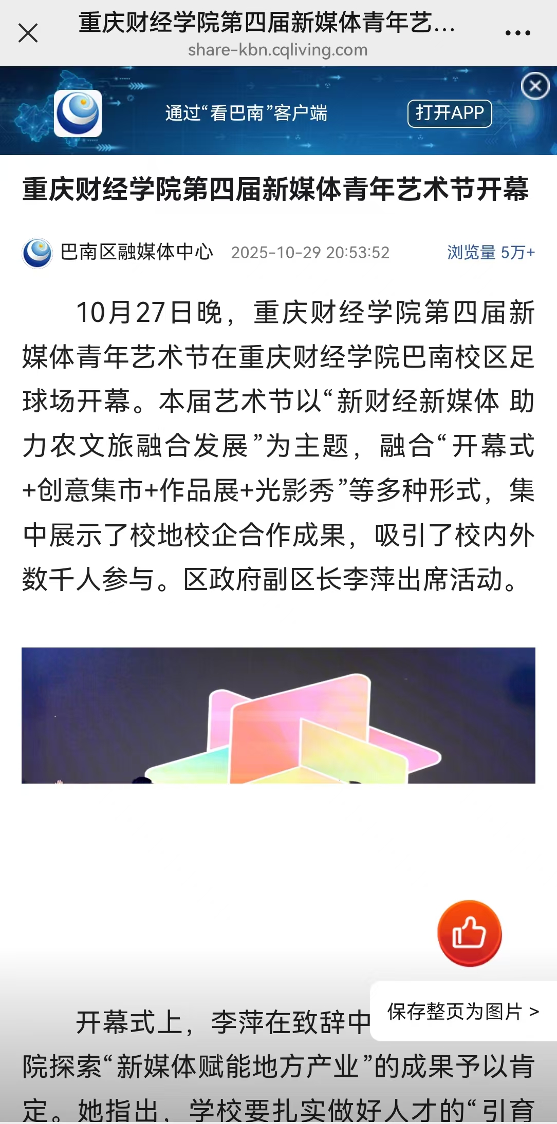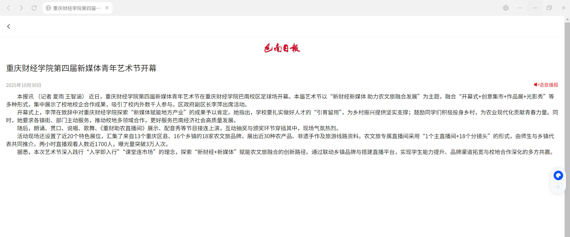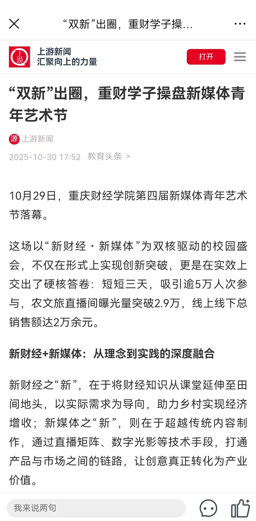 该校相关负责人表示,本届艺术节构建的“四方联动”模式,其核心精髓在于打破传统上各方相对独立的运作状态,将多方优势资源在一个开放、共享的平台上进行高效整合与精准对接。对正推进“数字文旅试验区”建设的巴南区而言,重庆财经学院提供了重要的智力支持和创意源泉;对学生而言,艺术节成为连接理论教学与产业实践的重要平台;对合作乡镇与农企而言,则获得了接地气、高效率的品牌推广渠道。这种创新模式将各方资源“拧成一股绳”,形成推动农文旅融合与乡村振兴的强大合力。