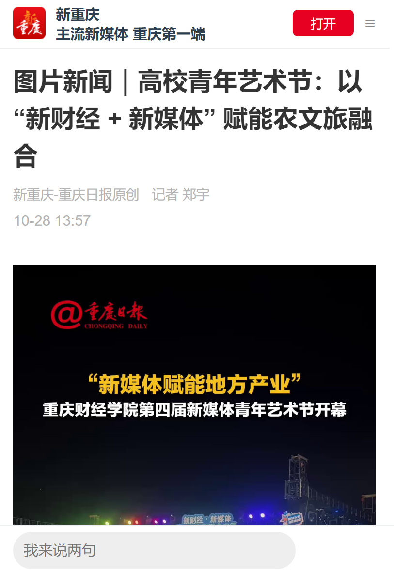 10月27日,重庆财经学院第四届新媒体青年艺术节在巴南校区开幕。本届艺术节以“新财经+新媒体”深度融合为特色,为期三天,通过政、校、企、研“四方联动”的创新模式,搭建起一座服务地方农文旅产业发展的“青春桥梁”,展现高校在服务社会与推动产教协同中的积极作为。