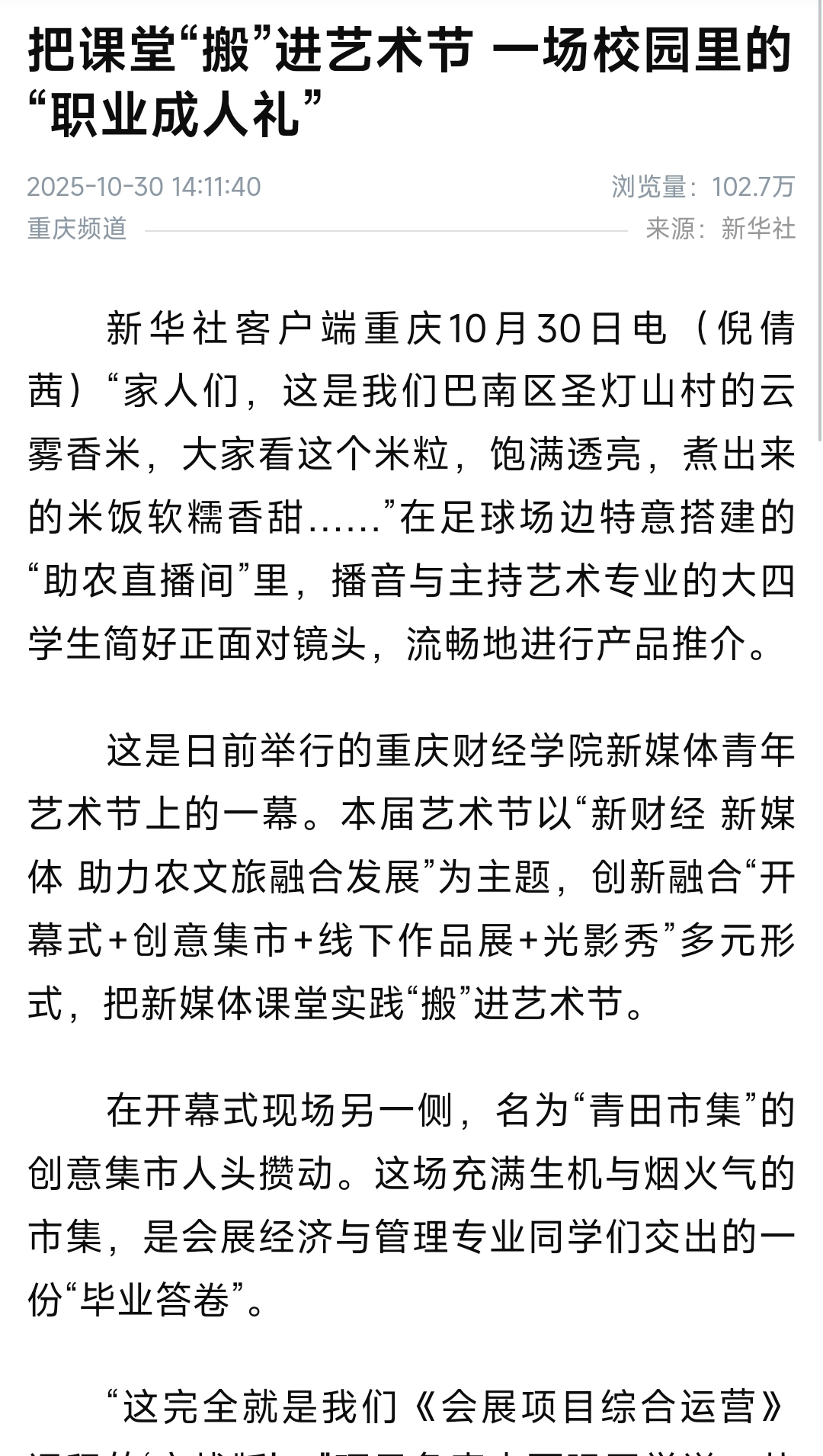 “艺术节不仅是教学成果的展示,更为学生搭建了连接产业、服务社会的‘青春桥梁’。”重庆财经学院校长吴华安表示,艺术节期间,学校还将推出创意集市、成果发布会、沉浸式光影展、线上线下作品展等多项活动,以‘看、听、买、玩’多元体验,推动农文旅资源‘活’起来,助力学生在策划与执行中积累实战经验。