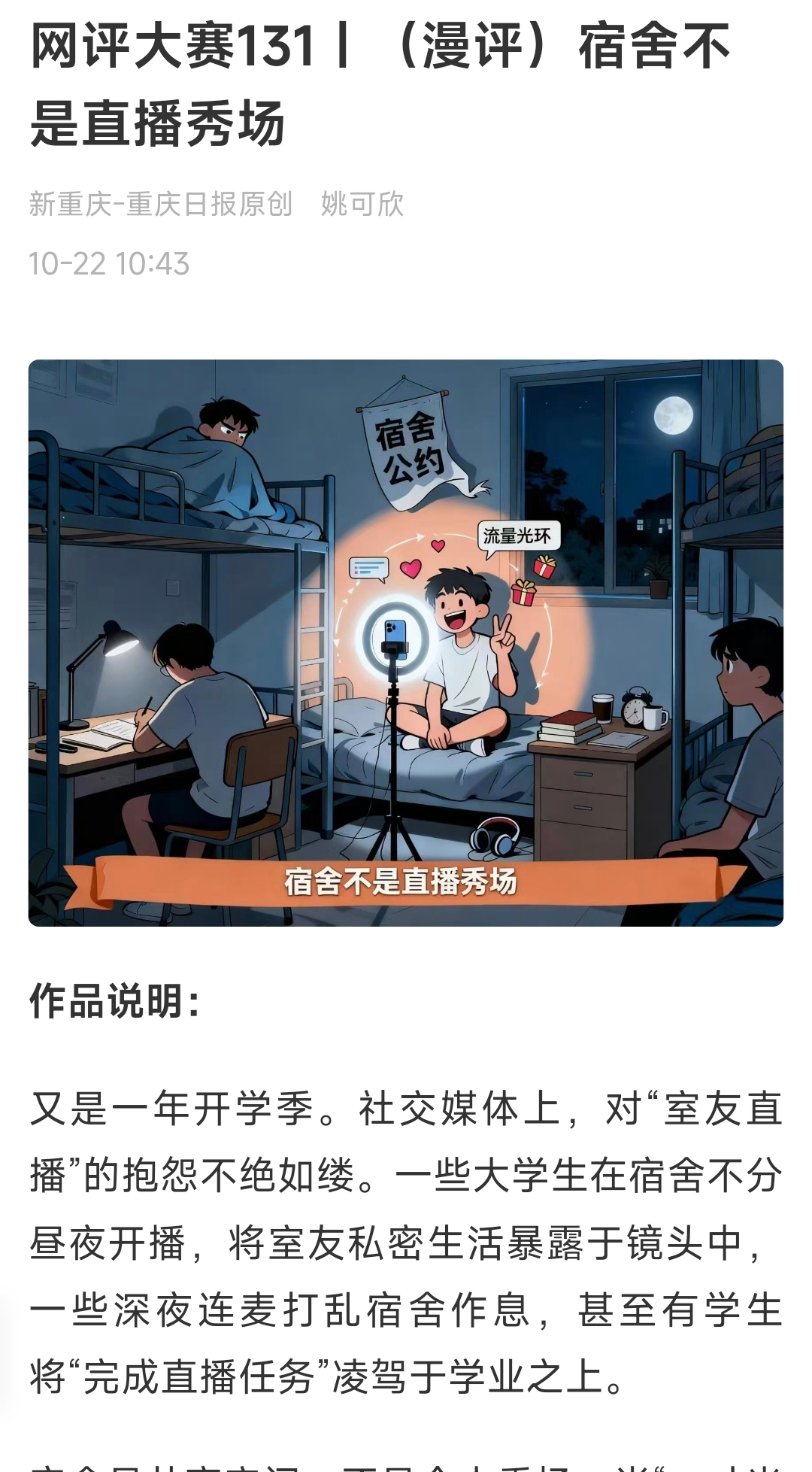又是一年开学季。社交媒体上,对“室友直播”的抱怨不绝如缕。一些大学生在宿舍不分昼夜开播,将室友私密生活暴露于镜头中,一些深夜连麦打乱宿舍作息,甚至有学生将“完成直播任务”凌驾于学业之上。