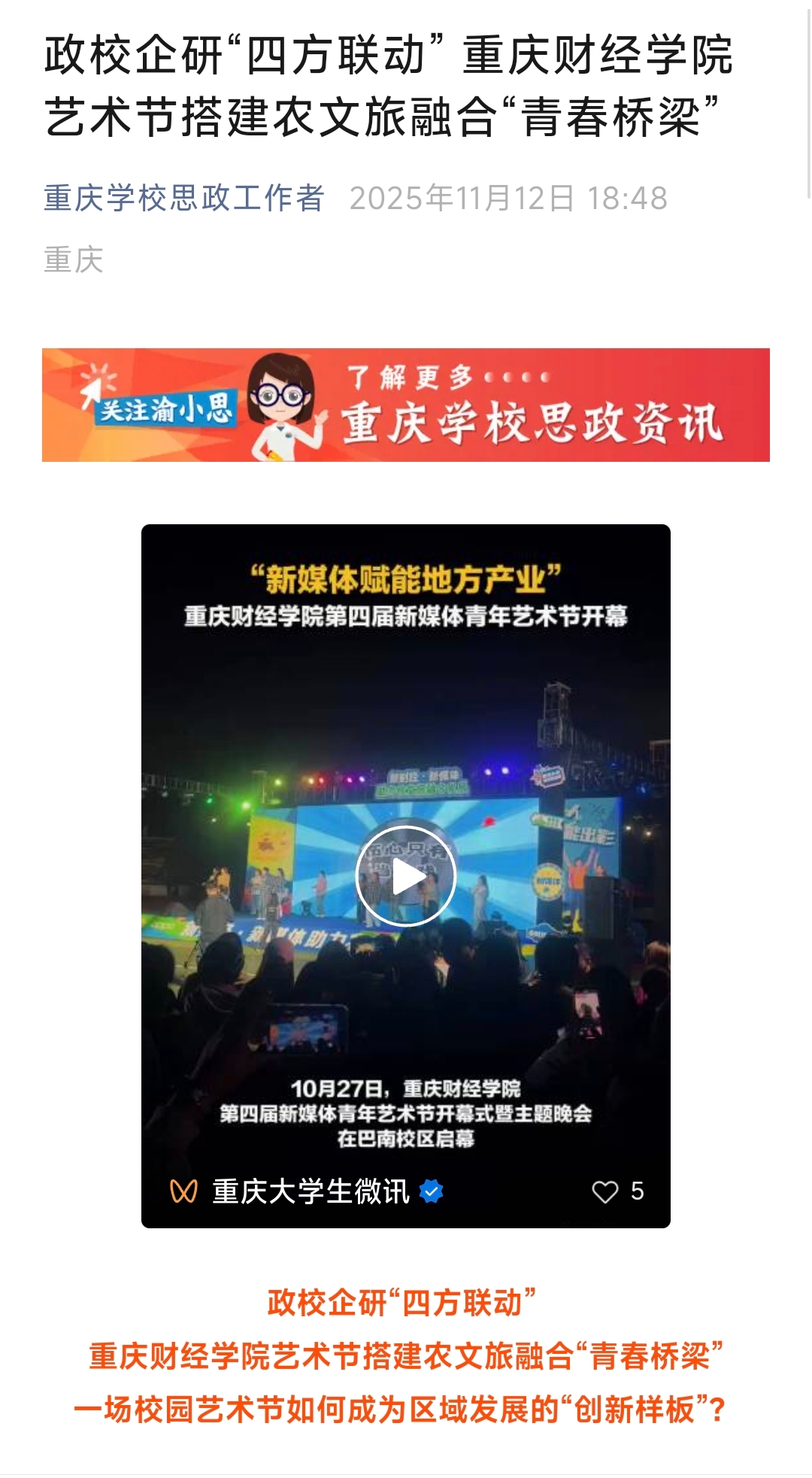 2025年10月27日至29日,重庆财经学院巴南校区内,一场超越校园边界的青春盛会——第四届新媒体青年艺术节,如火如荼地展开。这不仅仅是一场属于学生的文化庆典,更是一次深刻的区域协同实践,一个生动展现了“新财经+新媒体”如何赋能地方发展,并成功演练政、企、校、研“四方联动”模式的创新典范。它以丰硕的成果,向外界清晰地展示了高等教育在服务社会、推动产教融合中所能迸发的巨大能量。