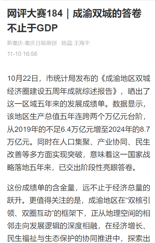 媒体链接;网评大赛184|成渝双城的答卷不止于GDP (cqrb.cn)