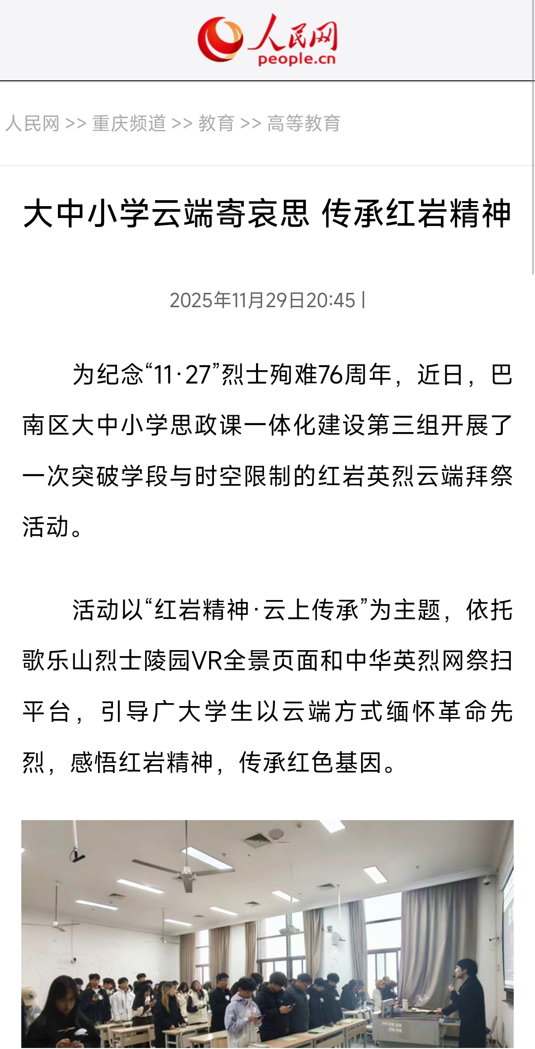 活动中,教师播放了关于“11·27”革命英烈牺牲历史的视频资料,带领学生回顾那段用鲜血铸就的英雄岁月。通过投影展示歌乐山烈士陵园VR全景画面,师生们实现了“云参观”烈士陵园。在中华英烈网祭扫平台,大家共同搜索红岩英烈的姓名,聆听英雄事迹,敬献电子鲜花并鞠躬致敬,表达对革命先辈的深切缅怀。