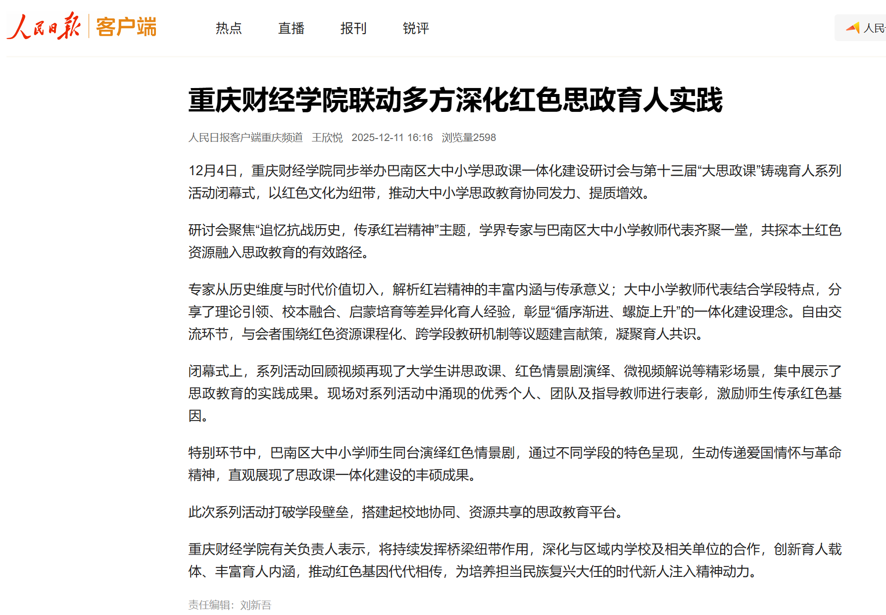 12月4日,重庆财经学院同步举办巴南区大中小学思政课一体化建设研讨会与第十三届“大思政课”铸魂育人系列活动闭幕式,以红色文化为纽带,推动大中小学思政教育协同发力、提质增效。