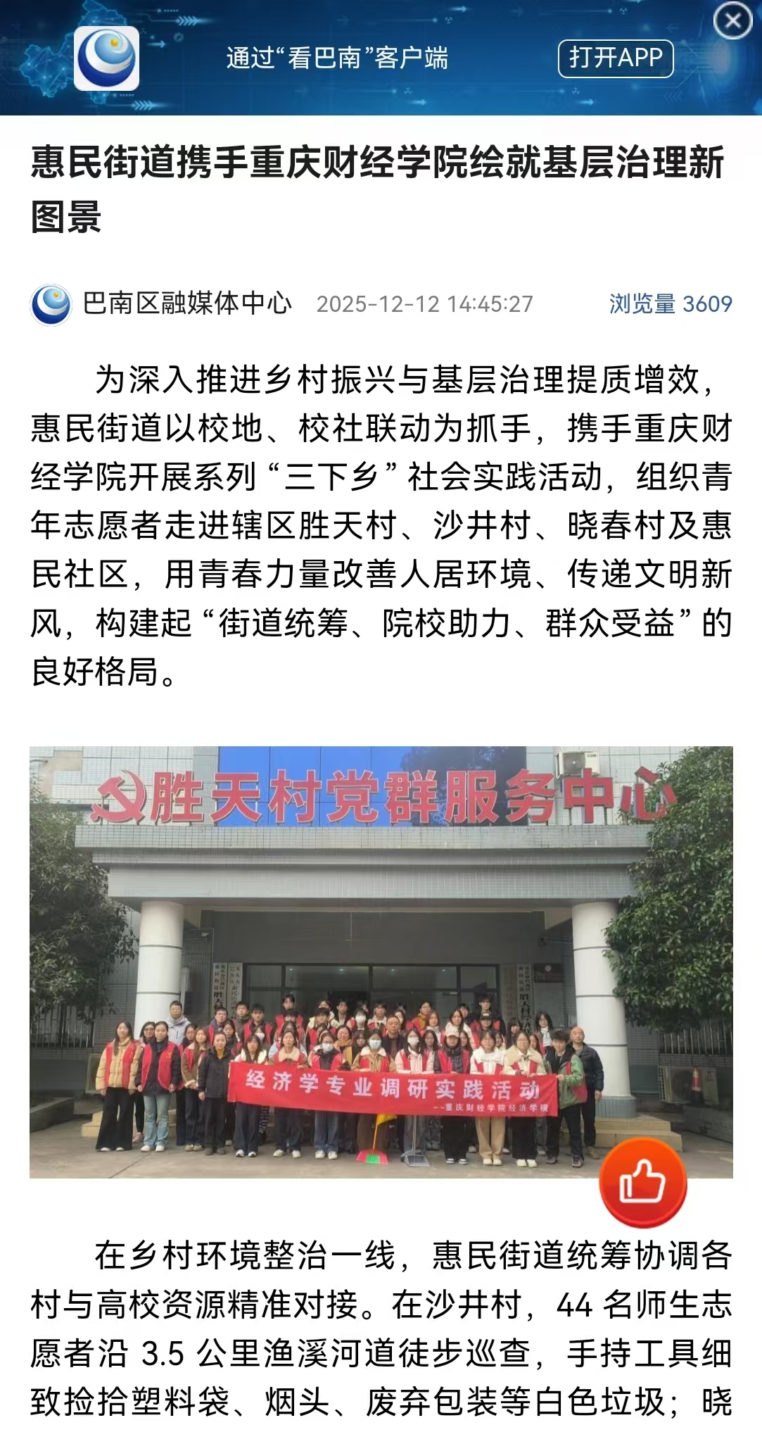 为深入推进乡村振兴与基层治理提质增效,惠民街道以校地、校社联动为抓手,携手重庆财经学院开展系列 “三下乡” 社会实践活动,组织青年志愿者走进辖区胜天村、沙井村、晓春村及惠民社区,用青春力量改善人居环境、传递文明新风,构建起 “街道统筹、院校助力、群众受益” 的良好格局。