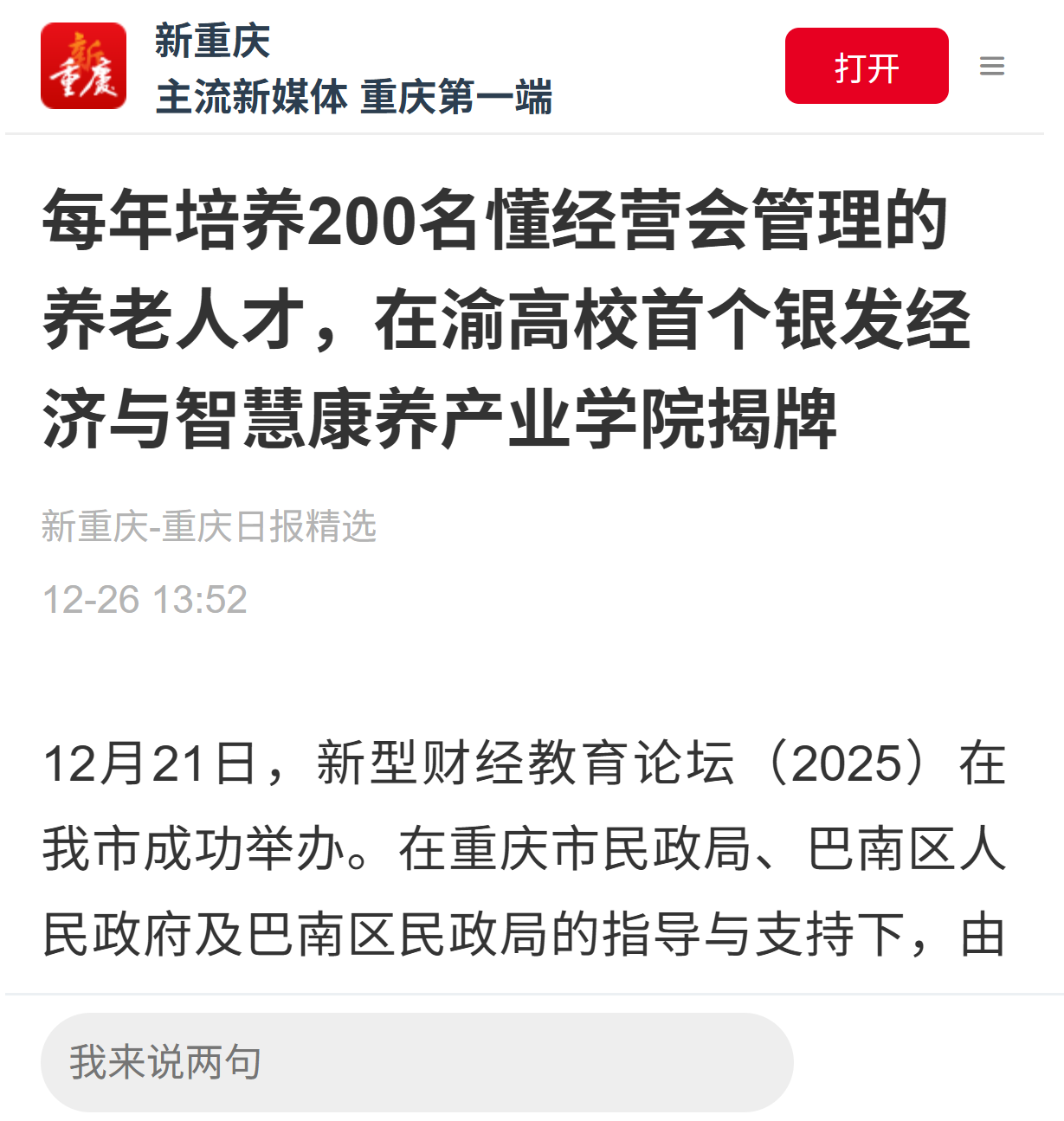 12月21日,新型财经教育论坛(2025)在我市成功举办。在重庆市民政局、巴南区人民政府及巴南区民政局的指导与支持下,由重庆市养老服务协会、重庆财经学院与重庆宏善实业集团有限公司联合共建的“重庆银发经济与智慧康养产业学院”正式揭牌成立。