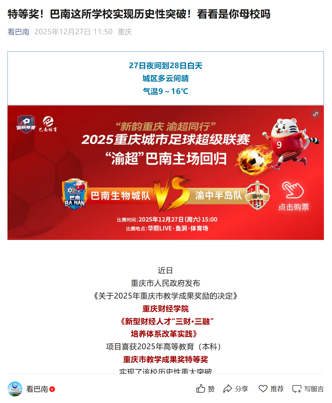 近日,重庆市人民政府发布《关于2025年重庆市教学成果奖励的决定》,重庆财经学院《新型财经人才“三财·三融”培养体系改革实践》项目喜获2025年高等教育(本科)重庆市教学成果奖特等奖,实现了该校历史性重大突破,彰显了学校在财经教育领域的创新实力。 该项目聚焦“新财经”发展趋势,通过“三财”并举、“三融”贯通,有效提升了教育教学水平和人才培养质量,具有重要的示范意义和推广价值。 媒体链接: https://mp.weixin.qq.com/s/TKeFknN5BuViV6NG7Wud0w