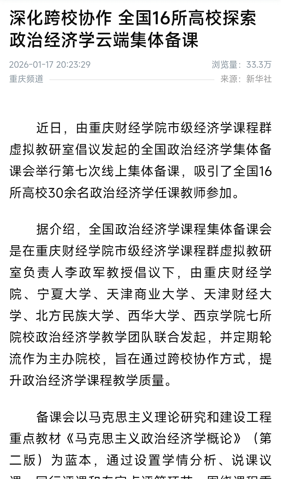 重庆财经学院相关负责人表示,集体备课会以一线教师教学需求为导向,探索形成了可复制、可推广的基层教研机制。下一步,学校将继续发挥牵头作用,联合成员高校在常态化集体备课基础上,进一步拓展经典文献研读和教学方法创新研究,不断提升政治经济学课程教学质量。