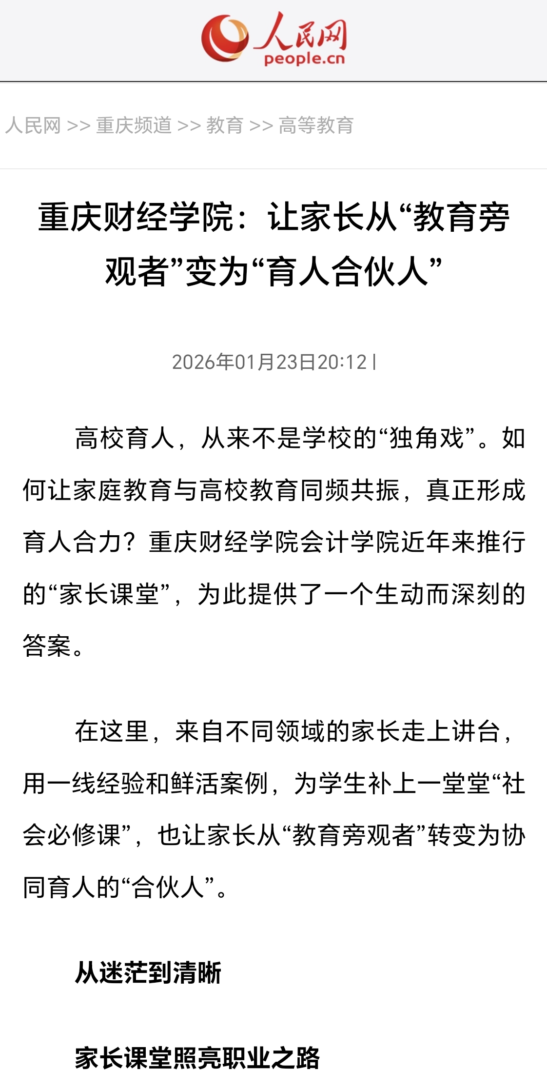 高校育人,从来不是学校的“独角戏”。如何让家庭教育与高校教育同频共振,真正形成育人合力?重庆财经学院会计学院近年来推行的“家长课堂”,为此提供了一个生动而深刻的答案。