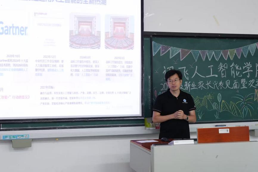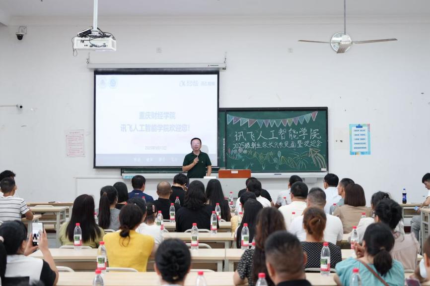 学校副校长(兼讯飞人工智能学院院长)张立,学校产教融合首席教授、讯飞人工智能学院学术带头人周启刚教授,讯飞人工智能学院党总支书记、副院长乐晓勇,讯飞人工智能学院常务副院长艾军勇、副院长曹飞,副院长、讯飞高教人才业务西南总监、科大讯飞高级工程师田荣阳、学团办公室主任江蕊弘,科大讯飞工程师付旺、余淼,2025级新生辅导员蔡霞、谢平,与102名来自全国各地的新生家长代表共聚一堂,展开深入而热烈的交流。本次会议由学院常务副院长艾军勇主持。