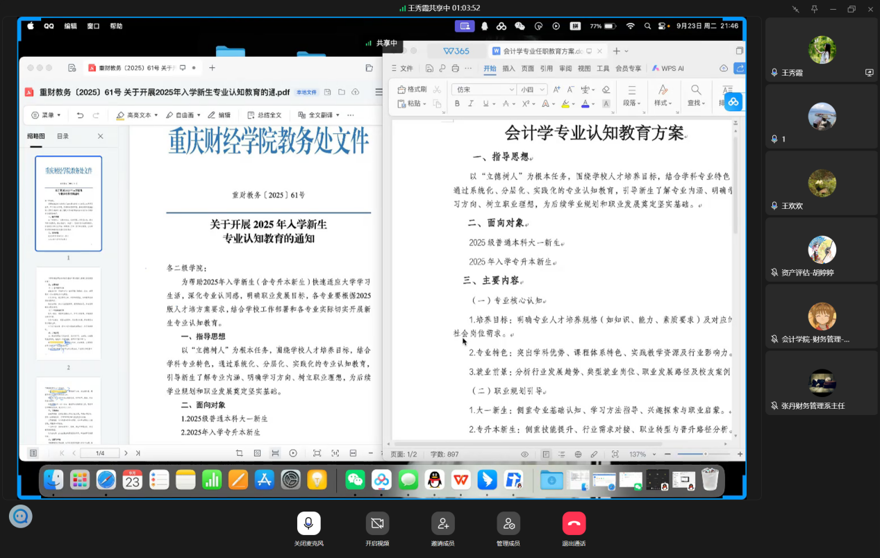 为精准落实《重财教务〔2025〕61号关于开展2025年入学新生专业认知教育的通知》要求,2025年9月23日,重庆财经学院会计学院正式启动2025级新生专业认知教育方案研讨。会计学院副院长王欢欢统筹部署,会计系主任王秀霞、审计教研室主任陈元媛、财务管理系主任张丹、副主任唐蕾、资产评估教研室主任胡婷婷牵头实施的特色方案同步落地。