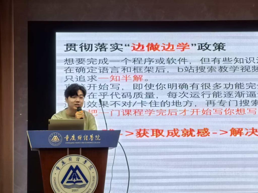 随后,蓝桥杯全国总决赛一等奖获得者、学生代表陈星言同学分享了自己的学习与参赛经验。他讲述了自己从对专业一知半解到深深热爱的转变过程,在学习中不断努力探索,逐步掌握专业知识与技能。他强调课堂学习是基础,课后自主学习和实践更为重要。他鼓励同学们积极参加学科竞赛,通过竞赛提升专业水平,锻炼团队协作和应对挑战的能力。他以自身参加国赛为例,详细介绍了备赛的艰辛与收获,激励新生勇于挑战自我,在大学实现人生价值。