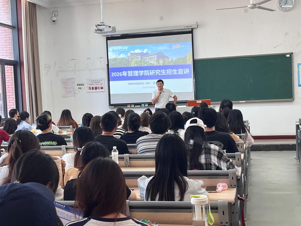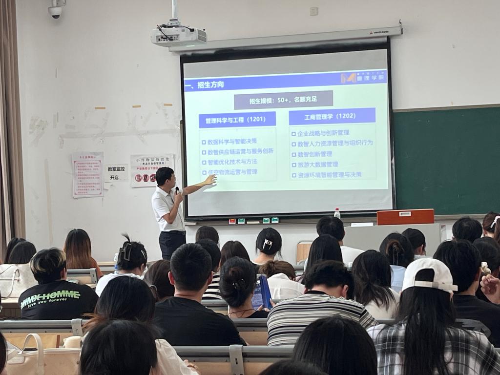 “人才培养”是本次宣讲的核心部分。副院长周林系统解读了管理学院各硕士点的培养特色、课程体系、导师队伍及学术资源。他特别强调了学院注重理论与实践相结合的教学模式,通过案例教学、企业实践、学术竞赛、国际交流等多种途径,全面提升学生的研究能力、创新思维和解决实际管理问题的能力,确保学生学有所成、学以致用。
