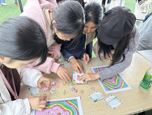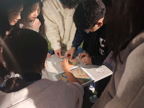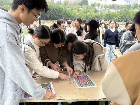 活动现场较为热烈的是“情绪碎片拼图乐园”。参与者沉浸于“收集→组装→解读分享”的完整过程中,将承载着不同情绪符号的碎片缓缓拼合成一幅幅完整的画面。这个过程既是对专注力与耐心的锻炼,更是一次直面内心、梳理情感的自我对话。许多同学在拼拼图的过程中,与伙伴述说着最近的烦恼,与工作人员聊着天,那些关于焦虑、喜悦、迷茫与希望的片段,在真诚的倾听与共鸣中得到了温暖的消解与抚慰,小小的拼图成为了照见情绪、连接彼此的独特媒介。