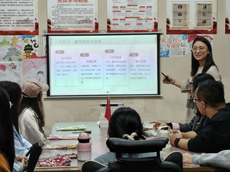 活动伊始,邹江老师以“民俗溯源+养生解码”为脉络展开专题讲解,从古人登高避灾、赏菊寄情的传统雅趣切入,阐释艾草等吉祥草木承载的祈福寓意,深入解读重阳民俗中蕴含的敬老情怀与中医养生智慧。她强调,重阳节既是中华优秀传统文化的重要载体,更是中医养生理念的鲜活体现,鼓励同学们以民俗为桥,将文化传承与健康实践相结合,争做新时代文化传播者与健康践行者。