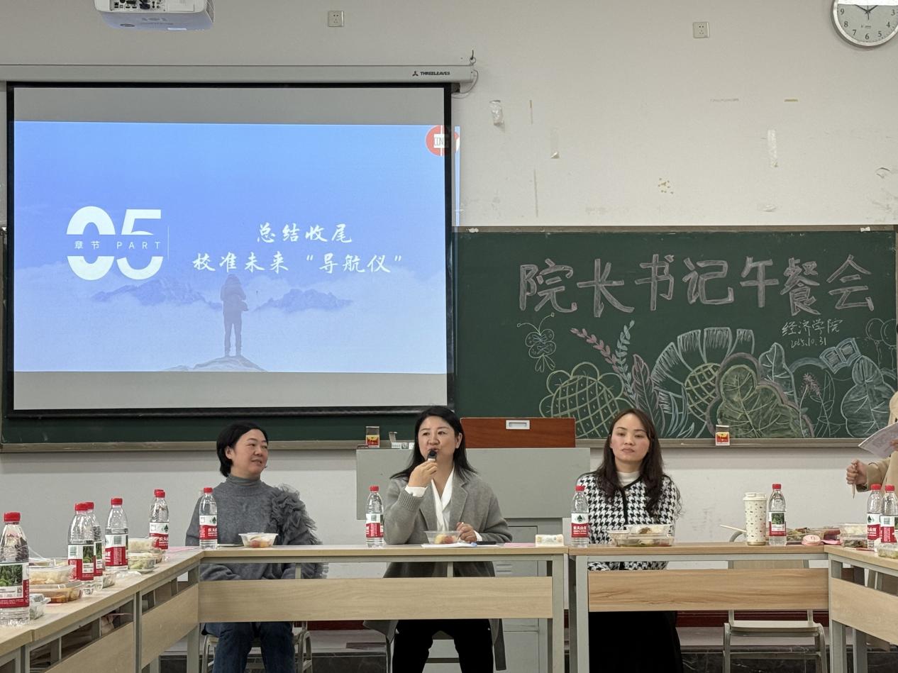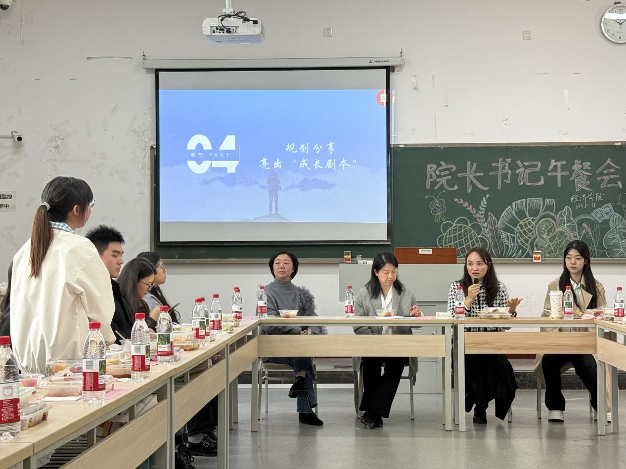 为精准对接学生成长诉求、持续优化人才分流培养方案,10月31日中午,经济学院在教学楼1413教室温情举办“聚焦分流培养,共话成长路径”院长书记午餐会。活动由韩宜航同学主持,经济学院院长宋湘琴、党总支书记刘莉、副院长刘春兰、学团办主任蔡婷,班级导师刘小双、李梨、游韵,全体专职辅导员及学生代表齐聚一堂,以“沉浸式”对话打破师生交流壁垒,解锁人才培养新场景。