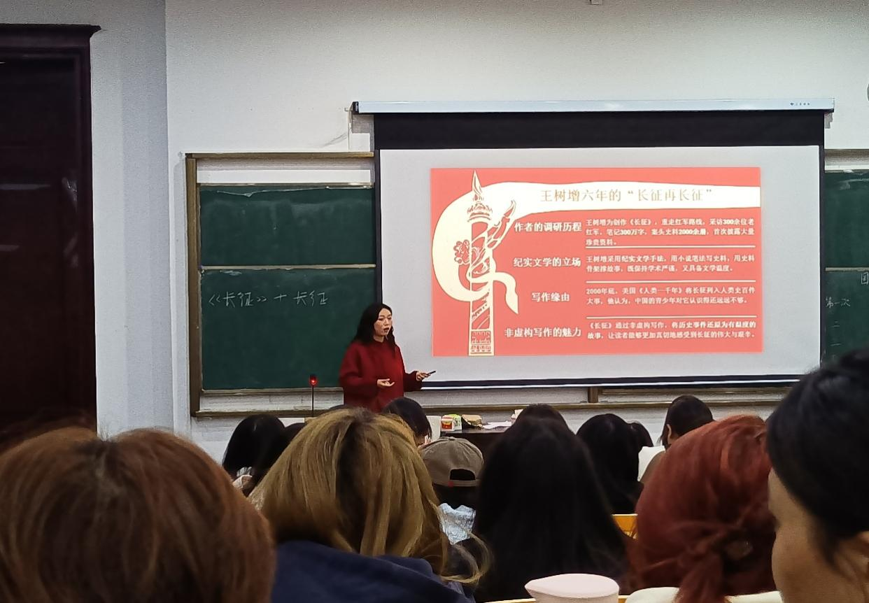 为教育引导广大青年学习传承弘扬伟大的长征精神,厚植爱国情怀,走好新时代长征路,图书馆11月12日下午在1126阶梯教室举行《长征》读书会,特邀马克思主义学院黄诗媛老师主讲,图书馆寸家菊老师和全校236名同学参加了此活动。全校师生齐聚一堂,在文字中重温二万五千里长征的壮阔史诗,在交流中感悟革命先辈的信仰之光,让爱国热情在书香浸润中燃烧。