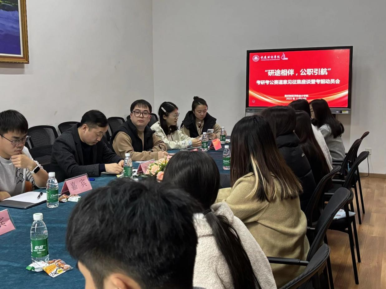 此次座谈会是会计学院深化分流培养、落实“个个有赛道,人人能出彩”育人理念的重要实践。活动不仅精准把握了备考学生的核心需求,为后续优化服务与完善支持体系提供了重要参考,还进一步凝聚了师生同心、共促成长的合力。学院将继续坚持以学生为本,强化分类指导与精准服务,助力广大学子在考研考公的赛道上行稳致远,书写精彩人生。