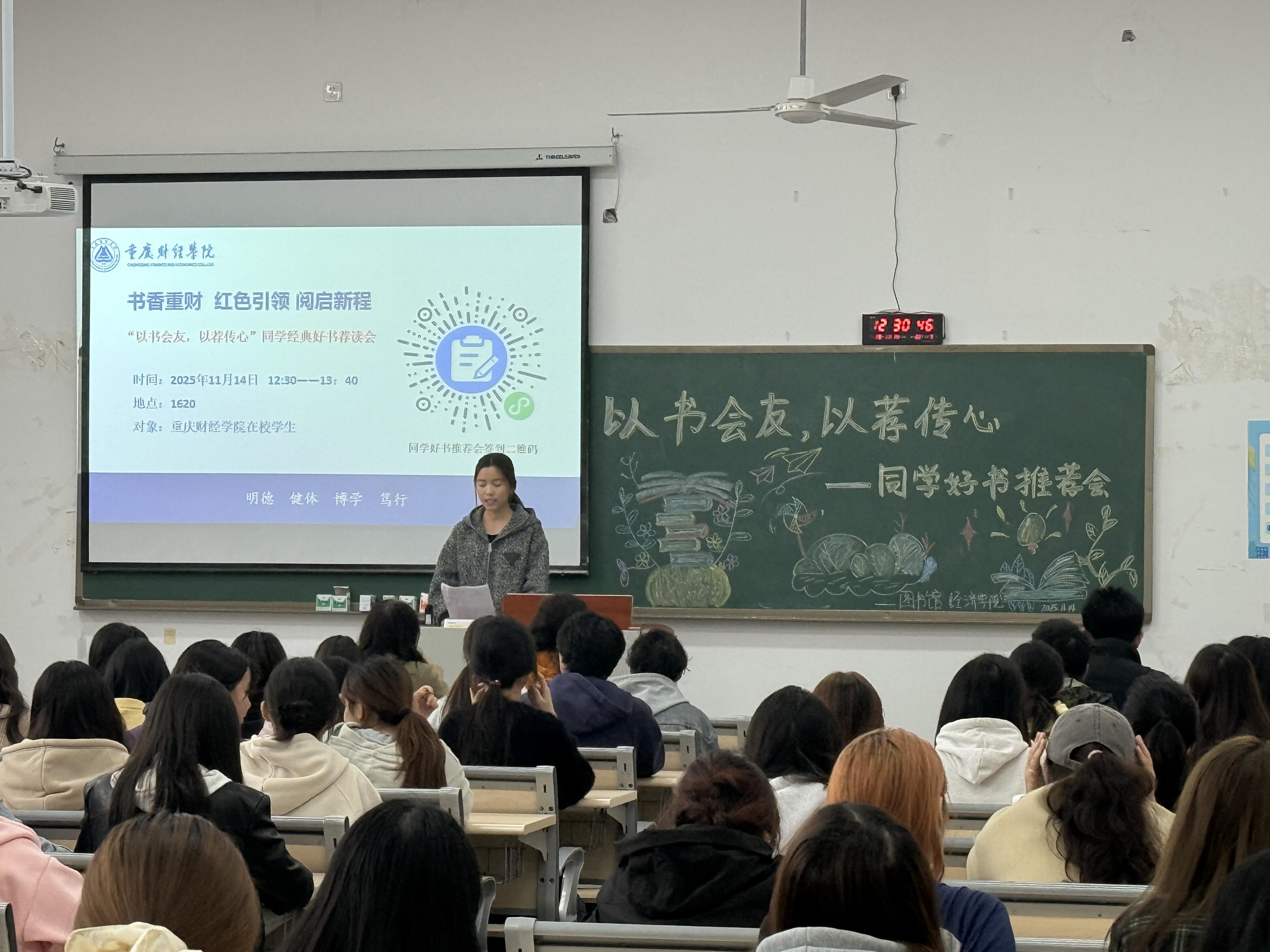 为营造浓厚读书氛围,搭建学子交流分享的书香平台,2025年11月14日中午12:30至13:40,“以书会友,以荐传心”好书推荐会在1620场地温情启幕。本次活动由图书馆与经济学院联合主办,图书馆管理员寸家菊老师、经济学院学团办主任蔡婷老师受邀出席,众多热爱阅读的同学齐聚一堂,共赴书香之约。