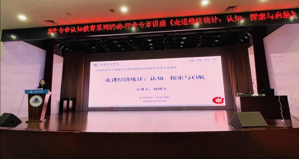 为深化新生对经济统计学专业的理解,明确未来学习方向与职业规划。2025年11月17日,经济学院在学术报告厅成功举办2025年经济统计学专业入学新生专业认知教育系列活动之行业专家讲座——《走进经济统计:认知、探索与启航》。