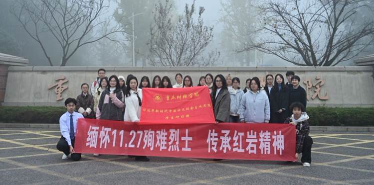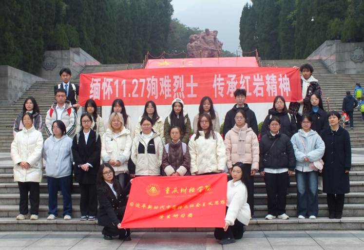 在“11·27”烈士殉难纪念日来临之际,为缅怀革命先烈,传承红色基因,2025年11月25日,重庆财经学院习近平新时代中国特色社会主义思想学生研习团学生代表一行,在马克思主义学院高雪莲、黄涛两位指导老师的带领下,前往歌乐山革命纪念地开展“行走的思政课”实践教学活动。此次活动通过庄严祭奠、沉浸式参观和现场教学,让思想政治教育在历史现场“活”起来。