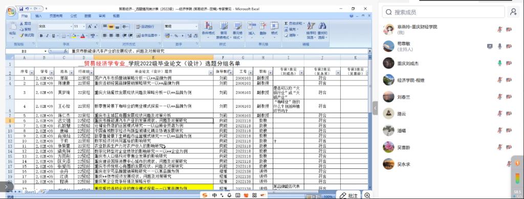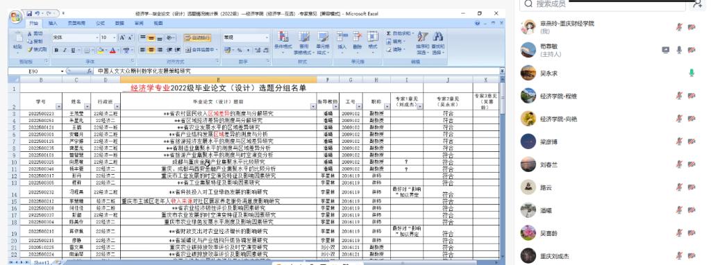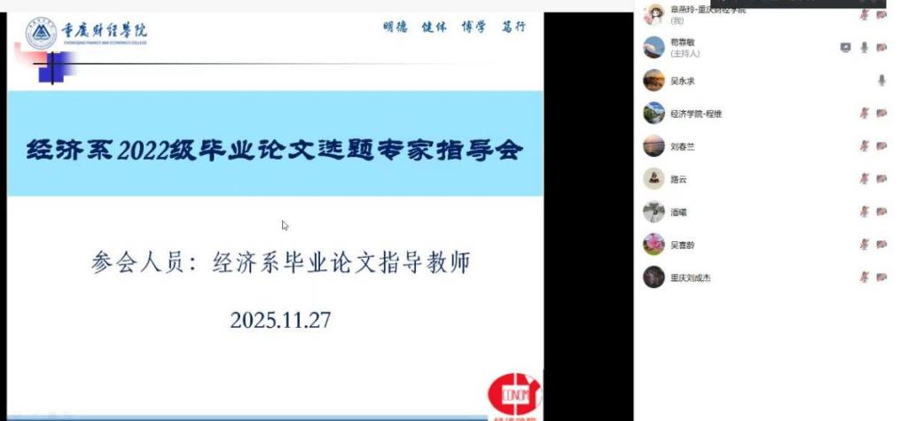 为进一步提升本科毕业论文质量,严把选题关,经济学院经济系于11月27日通过腾讯会议组织召开2026届本科毕业论文选题专家指导会。会议由学院骨干教师苟靠敏主持,教学副院长刘春兰及经济系全体专职教师参会。特邀重庆大学经济与工商管理学院教授、博士生导师吴永求教授,广州新华学院经济与贸易学院副院长吴喜龄副教授,重庆工商大学经济学院刘成杰教授出席指导。苟靠敏老师代表学院对三位专家的莅临表示热烈欢迎与诚挚感谢,强调专家指导对提升论文质量的重要意义。