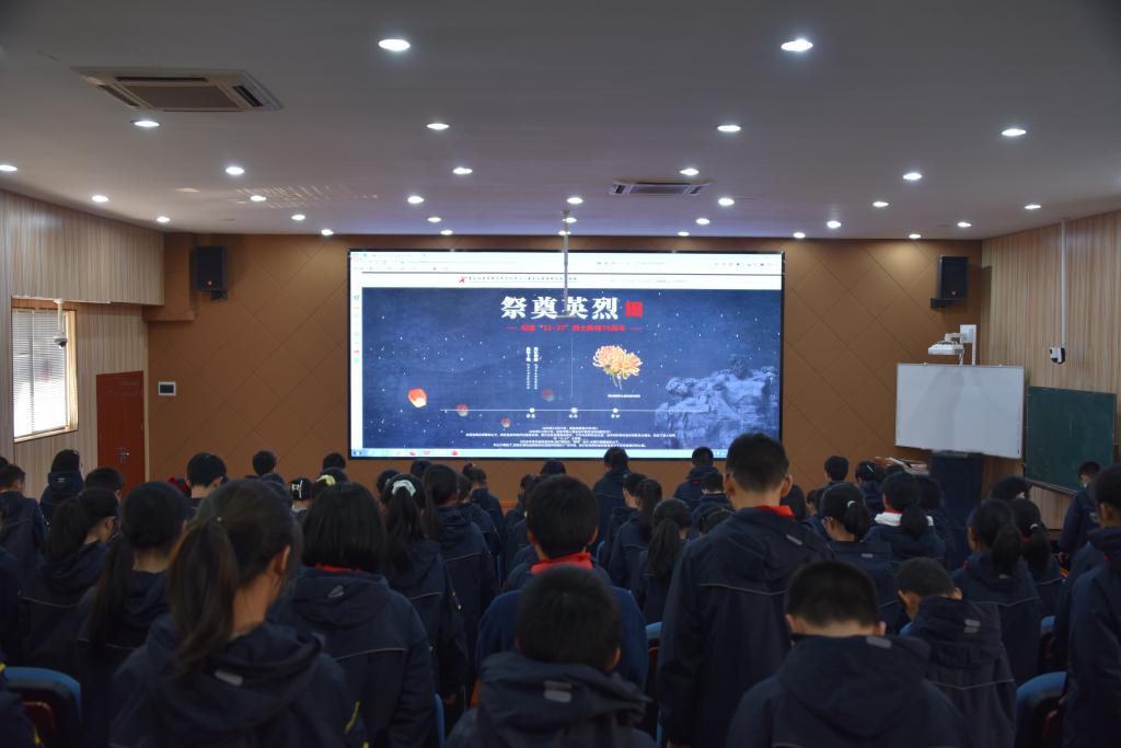 “红岩精神·云上传承”红岩英烈云端拜祭活动打破了学段和时空的限制,打造沉浸式云端思政课堂。整个祭拜活动庄重肃穆,先由组织老师播放了“11·27”革命英烈牺牲视频,引导同学们深刻了解了“11·27”纪念日那段用鲜血铸就的英雄历史;然后运用投影仪投放“VR全景”,让同学们“云参观”歌乐山烈士陵园;接着进入“中华英烈网”的祭扫页面,搜索红岩英烈们的姓名,讲述他们的英雄故事,为红岩烈士献上电子鲜花并鞠躬致敬,以此向红岩英烈表达缅怀之情。