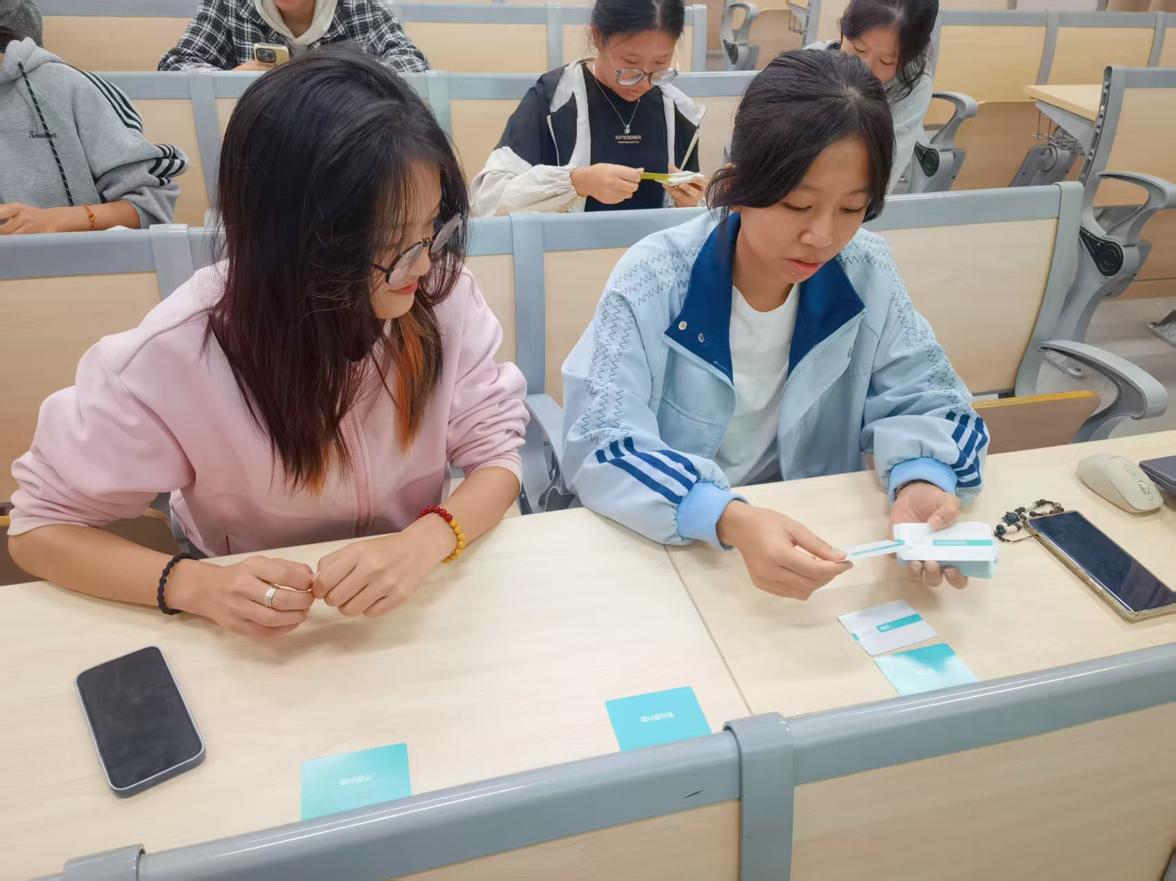 在交流互动环节,同学们围绕专业方向选择与能力提升路径踊跃提问,潘老师结合具体案例予以细致解答。随后的“职业分类卡”体验活动以轻松有趣的方式,帮助学生进一步识别职业类型,明确个人定位。