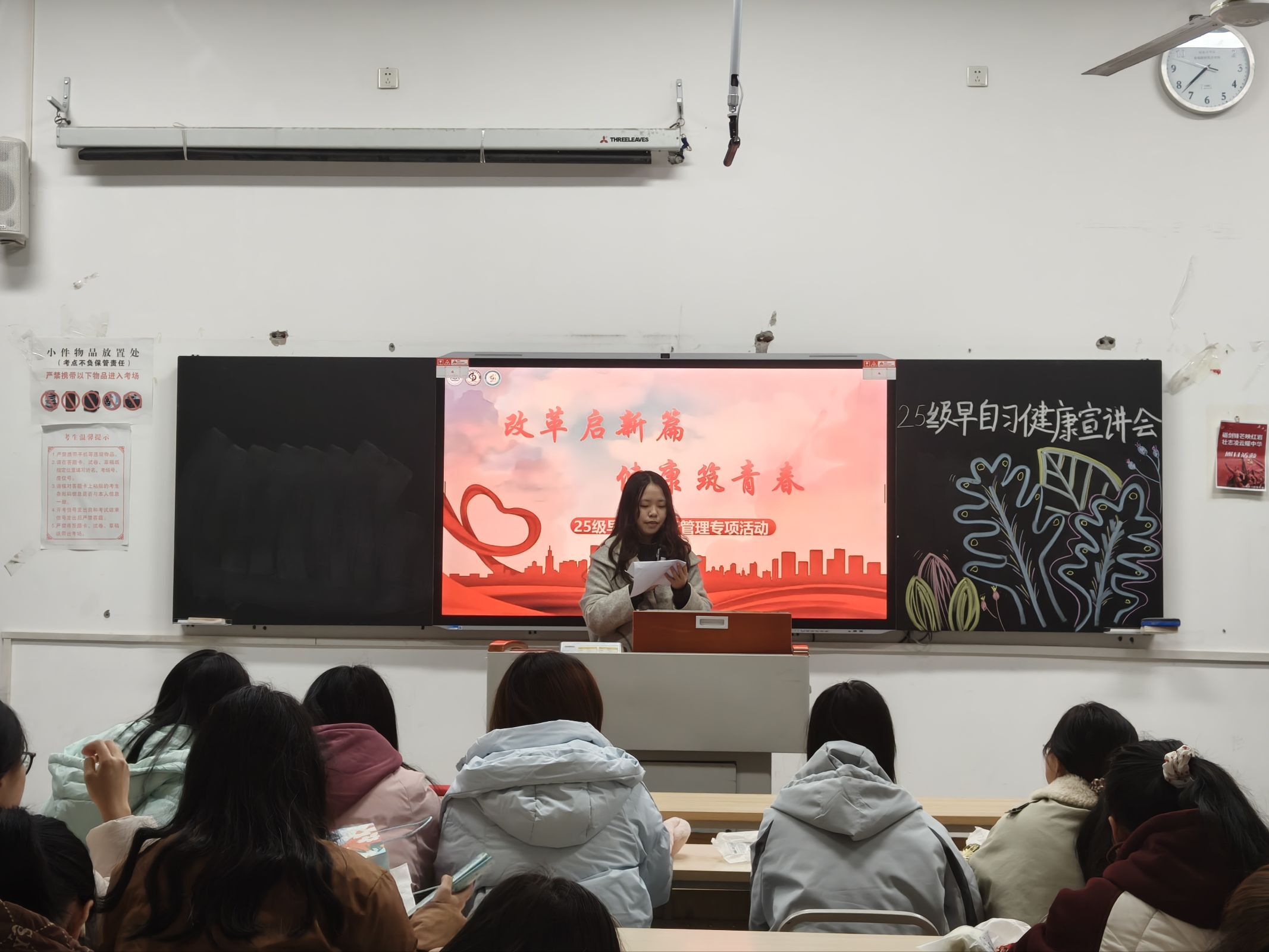 为助力重庆财经学院公共管理学院2025级新生适应早自习改革,培养适配早自习新模式的健康生活与学习习惯,12月10日,公共管理总协会精心举办“改革启新篇,健康筑青春——2025级早自习健康管理专项活动”。此次活动积极响应校园健康促进相关工作部署,深度融入“健康Π”计划核心理念,充分结合健康服务管理专业特色,为新生开启健康校园生活新篇章奠定坚实基础。
