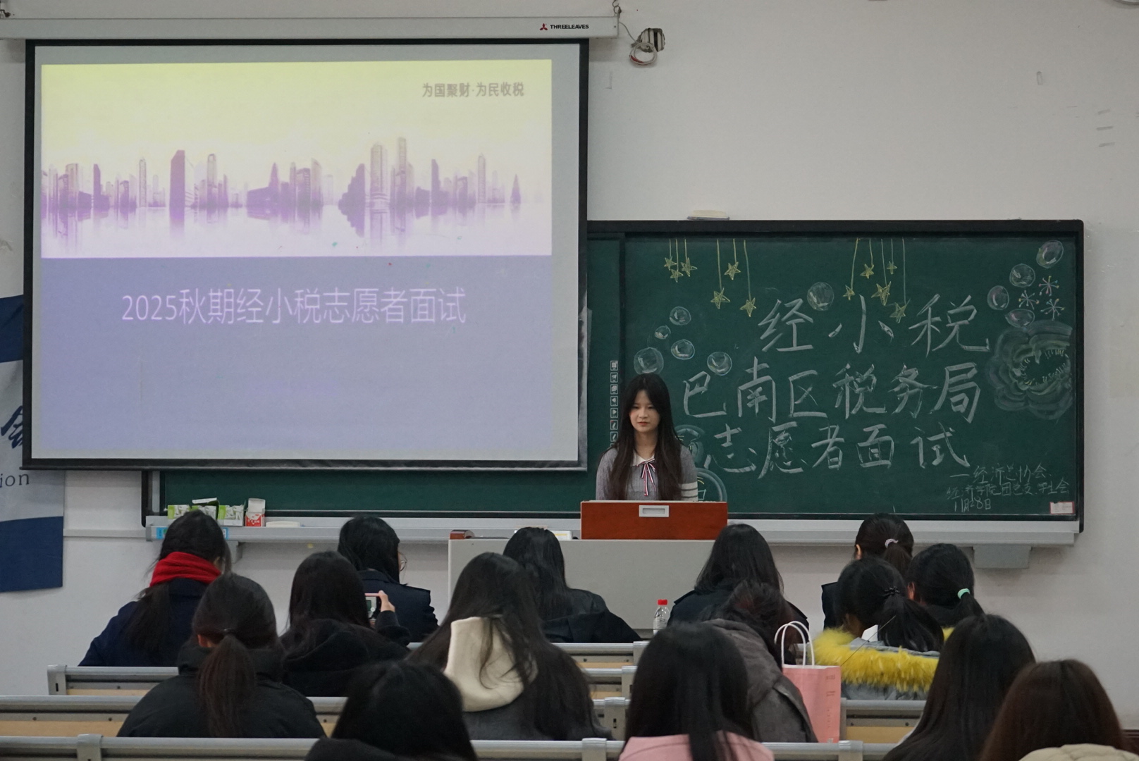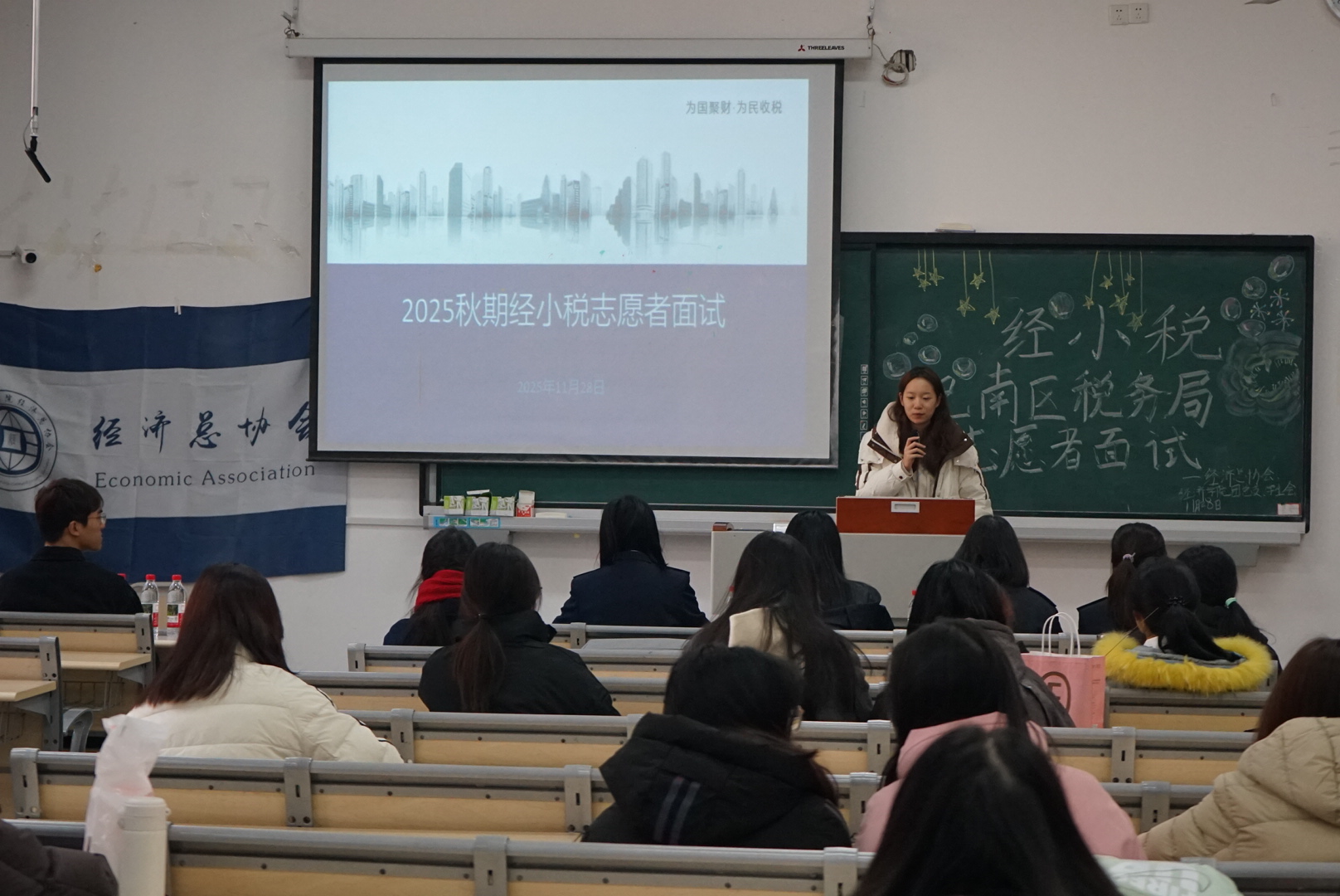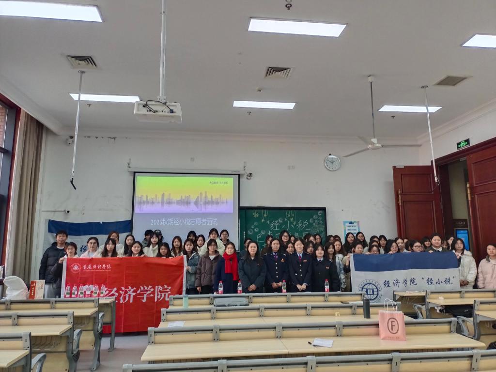 近日,2025秋期“经小税”巴南区税务局志愿者面试在教学楼顺利举行。本次面试由经济总协会组织联合经济学院团总支、学生会共同举办。由巴南区税务局所长扈莹及段媛、钟倩、詹槟雨三位老师共同担任面试官,来自经济、会计、金融学院的63名学生参与角逐,最终39人凭借扎实的专业素养与良好的服务意识成功通过考核,跻身税务志愿服务队伍。