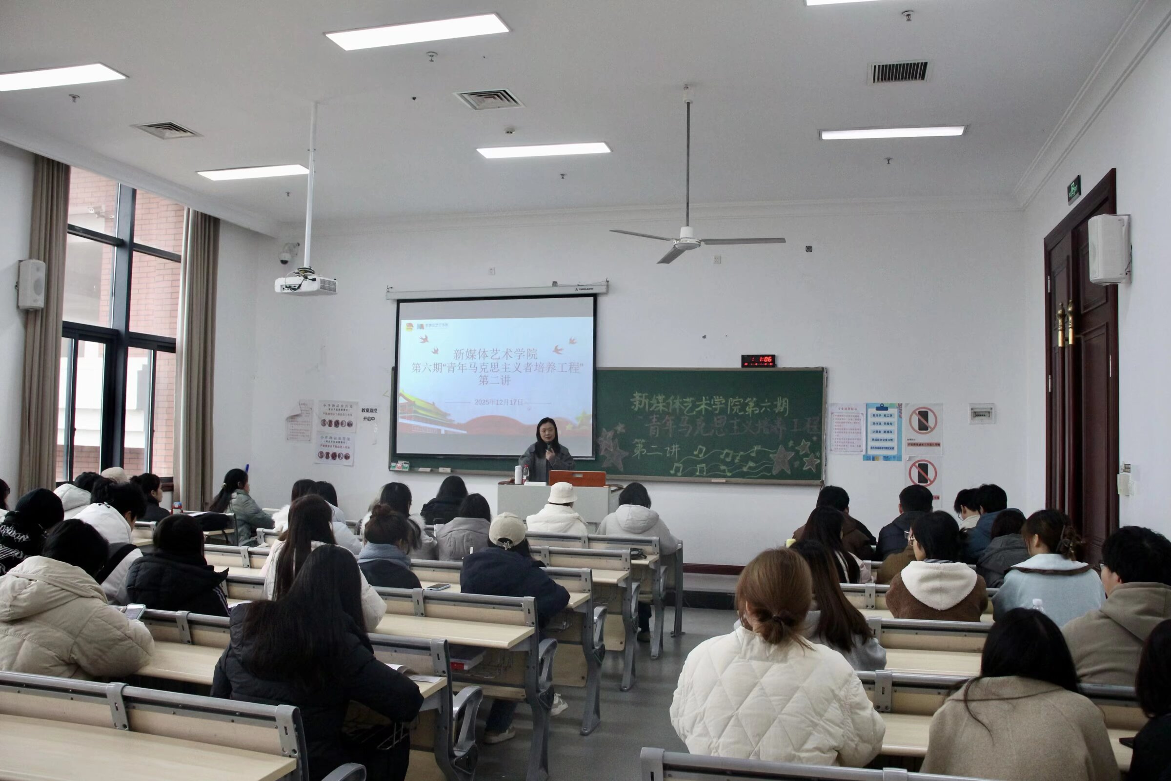 为深入学习贯彻党的二十届四中全会精神,筑牢青年学子思想根基,12月17日,我校新媒体艺术学院第六期“青年马克思主义者培养工程”(以下简称“青马工程”)第二讲在教学楼1601教室顺利举行。学校党委委员、学院党总支书记倪倩茜应邀作主题宣讲,团总支书记朱明明出席活动,第六期全体“青马工程”学员参加学习。