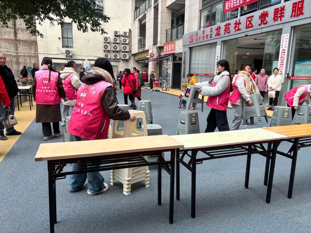 | (图二志愿者协助社区工作人员摆放桌椅) |