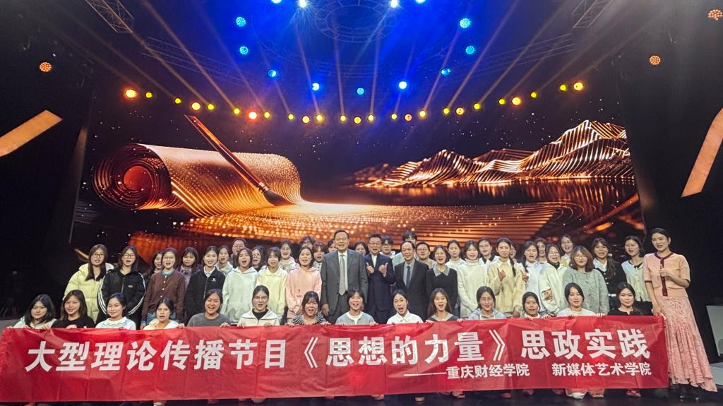 为深化实践教学,引导学生在真实场景中感悟思想伟力,12月27-29日,我校新媒体艺术学院邹烨、田邵唯、朱明明三位教师带队,分三批次组织150余名学生,全程参与由中共重庆市委宣传部主办、重庆广电集团承办的大型理论传播节目《思想的力量》现场录制。节目内容以“深学笃行习近平文化思想”为大主题,以《习近平文化思想学习纲要》为依循,围绕“十五五”规划与高质量发展主题,以嘉宾访谈、实践案例展示等形式展开深度探讨,通过沉浸式学习方式,助力学生更加直观、深入地理解习近平文化思想的丰富内涵与实践价值。