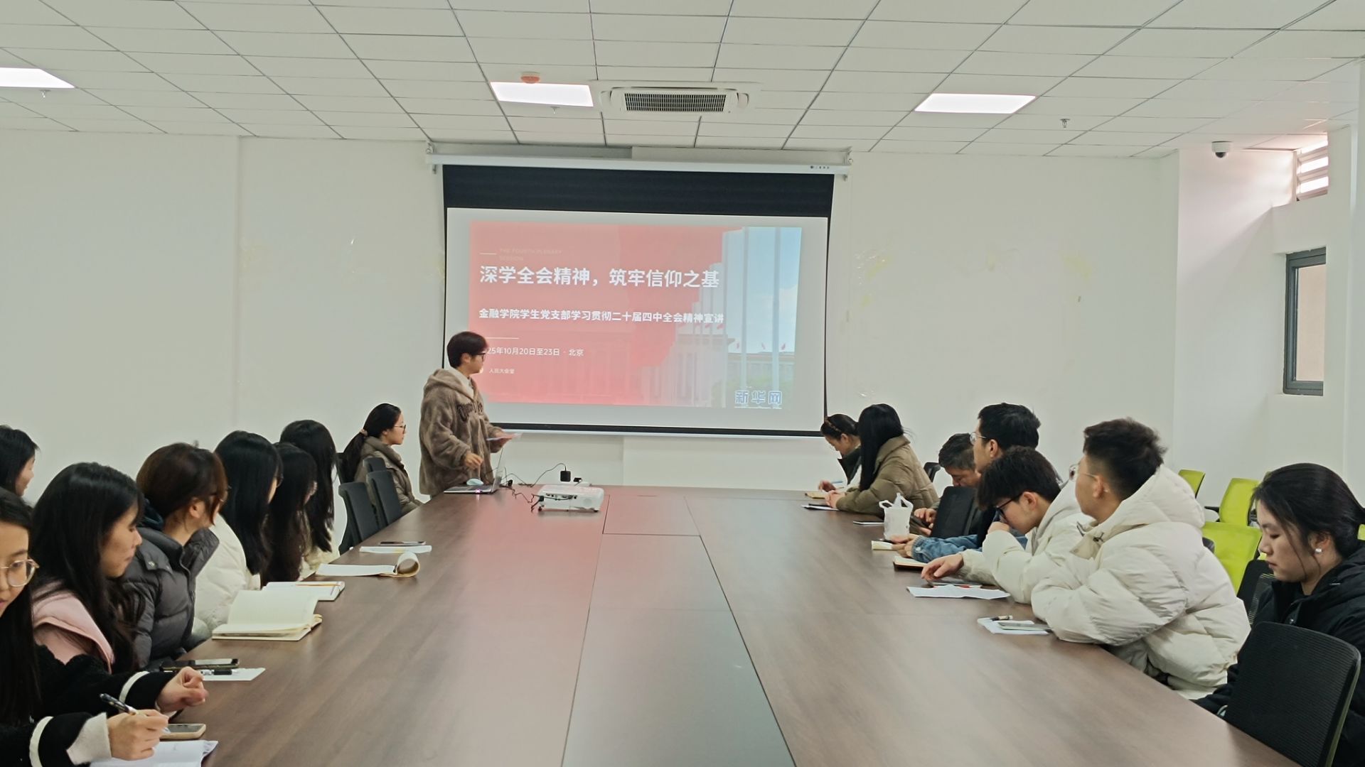 学院党总支书记张玉华面向全体学生党员、入党积极分子开展专题宣讲。宣讲中,张玉华书记围绕党的二十届四中全会的重大历史意义、核心要义和实践要求,结合金融学科发展趋势与青年学生成长成才规律,从“坚定政治立场、锤炼专业本领、服务国家战略” 三个维度进行系统阐释。她强调,青年学生是国家发展的生力军,金融专业学子更要立足学科特色,将个人理想融入国家金融事业发展大局,在学习贯彻全会精神中找准人生坐标,努力成为可堪大用、能担重任的时代新人。此次宣讲为学生党支部深入推进全会精神学习指明了方向、提供了遵循